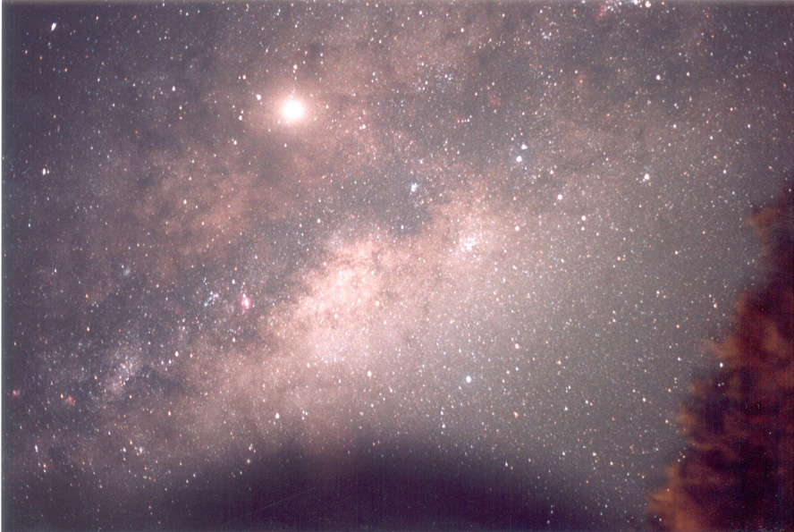 This photograph shows Mars (the brightest object) among the stars and nebulae that form the Milky Way.