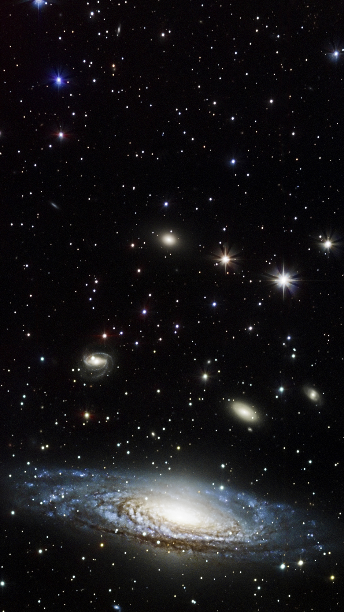 NGC7331, descubierta en 1794 por William Herschel, es una de las galaxias más brillantes que no están incluidas en el catalogo de Messier. En ella se puede apreciar una ligera estructura de brazos espirales a pesar de su poca inclinación, ya que está situada casi ?de canto?. Esta galaxia fue una de las primeras galaxias reconocidas como de tipo espiral e incluidas por Lord Rosse en su lista de 14 ?nébulas espirales o curvilíneas?. En 1959, Milton Humason descubrió una supernova, SN1959D, muy cerca de su núcleo (32? W y 13? N), la cual llegó a alcanzar un brillo de 13,4 mag. Se estima que su masa está en torno a 140 mil millones de veces la masa solar y que se encuentra situada a 50 millones de años luz. Se puede asumir que la apariencia que presenta nuestra galaxia vista desde muy lejos es muy similar a la que ofrece esta galaxia. En la parte superior de esta imagen se pueden observar otras galaxias compañeras que están mucho más lejos de nosotros.