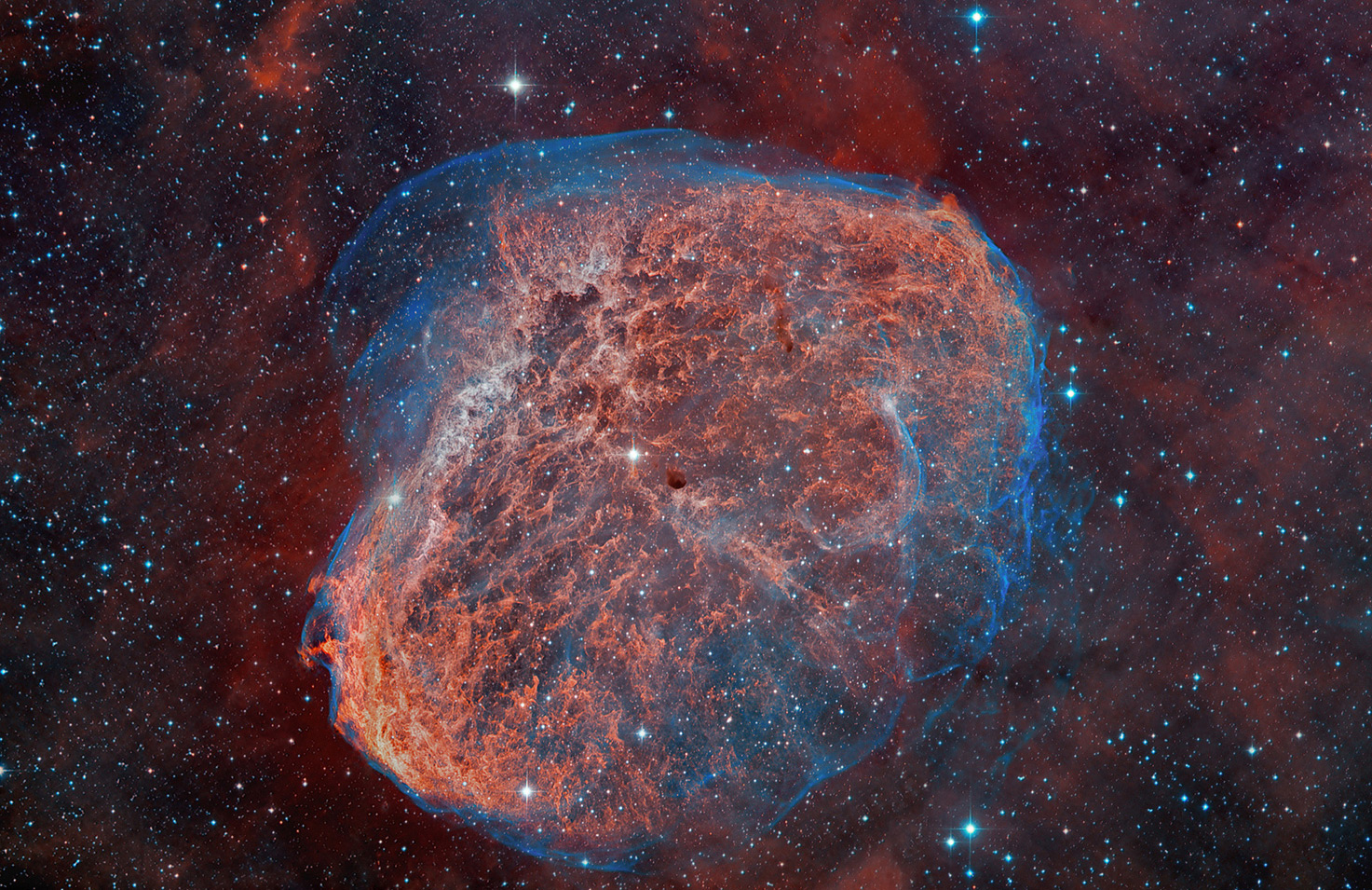 La nebulosa de la media luna, NGC 6888, se encuentra en la constelación del Cisne, a unos 4.700 años-luz de la Tierra. Los estudios realizados a este objeto indican que su formación se debió a la estrella central, visible en la imagen, cuando, hace unos 250.000 años se convirtió en una estrella tipo Wolf-Rayet. La estrella expulsó sus capas más externas, impulsadas por los fuertes vientos estelares, y éstas fueron ionizadas por la radiación ultravioleta. Estas estrellas suelen ser muy masivas y brillantes, y la nebulosa que vemos se formó debido a la enorme pérdida de material de la estrella.