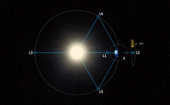 ARIEL will be placed in orbit around the Lagrange Point 2 (L2), a gravitational balance point 1.5 million kilometres beyond the Earth’s orbit around the Sun. Credit: ESA/STFC RAL Space/UCL/Europlanet-Science Office