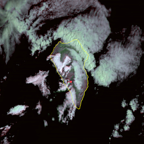 The Cumbre Vieja volcano from Space, taken with the DRAGO space camera. In yellow, the shape of La Palma. And in red, the heat source of the volcano. Credit: IACTEC-Space.