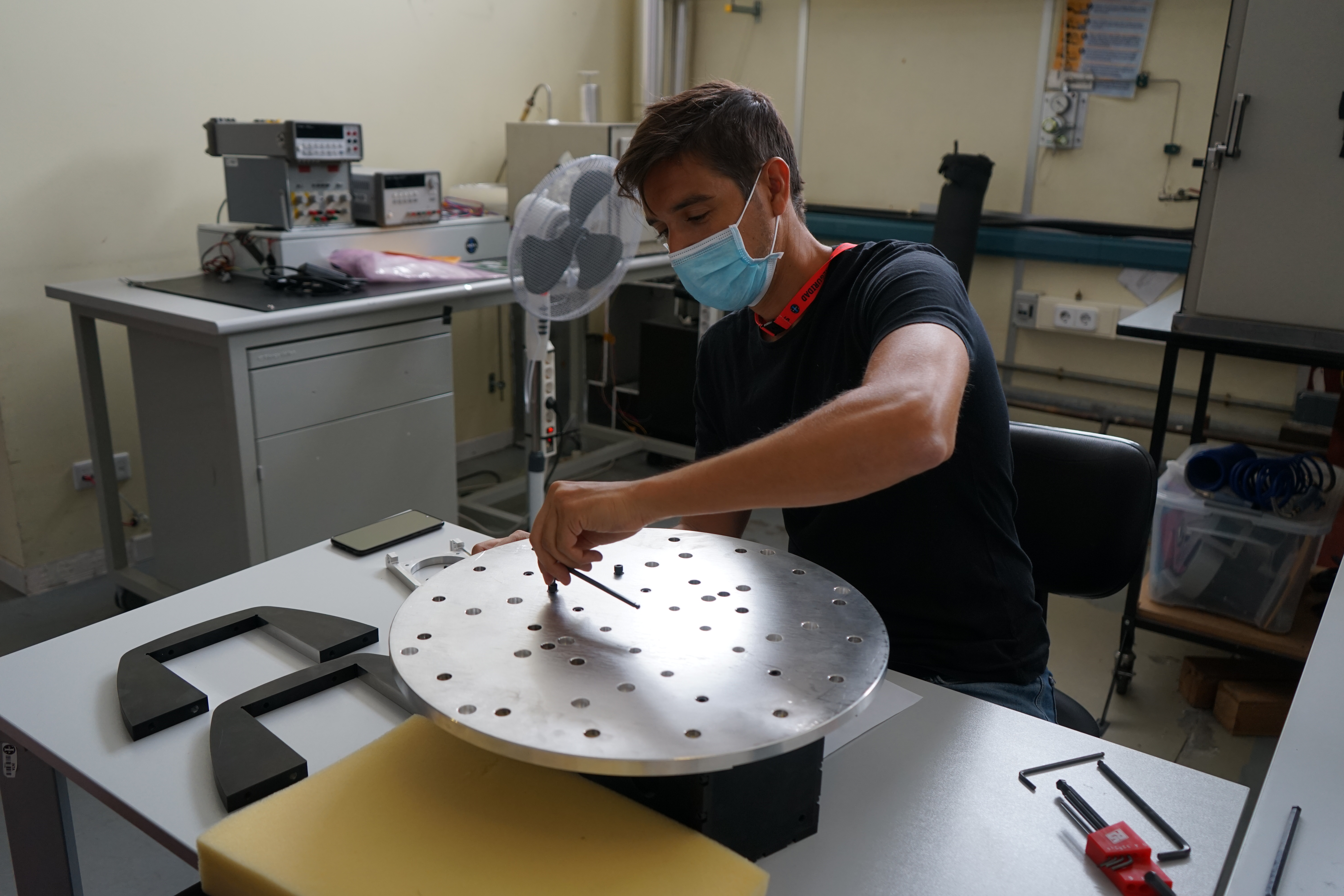 Imagen de Pablo de Chaves, ingeniero de IACTEC, ensamblando el útil de test para los ensayos de vibración del instrumento DRAGO en las instalaciones del Área de Ensayos del INTA (Instituto Nacional de Técnica Aeroespacial). Crédito: Alba Peláez (IAC).