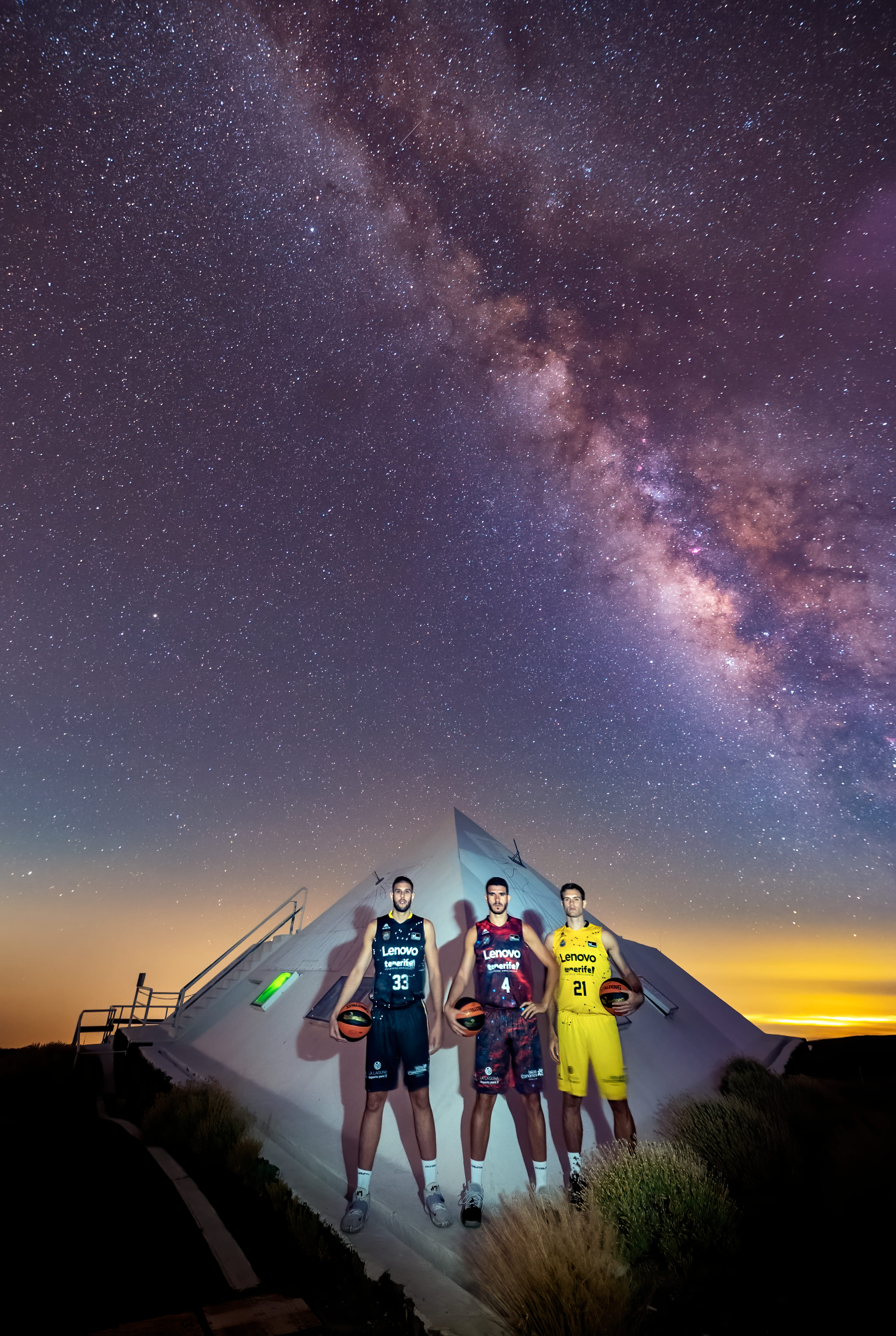 Los jugadores del Lenovo Tenerife Iván Cruz-Uceda , Sergio Rodríguez y Tim Abromaitis con las nuevas equipaciones inspiradas en el cielo de Canarias en el Observatorio del Teide. Créditos: D. López / IAC