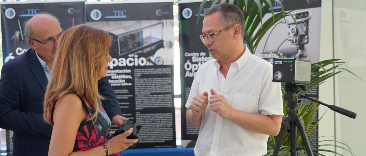 La presidenta del Cabildo de Tenerife, Rosa Dávila, habla con el investigador principal de IACTEC-Espacio, Álex Oscoz, sobre la cámara infrarroja DRAGO, a la derecha de la imagen. Crédito: Alejandra Rueda (IAC).