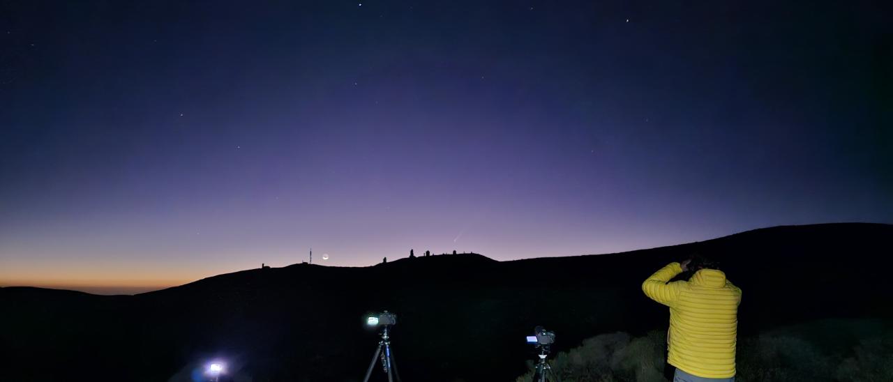 Durante las primeras horas de la noche podremos disfrutar de la presencia de Venus (brillante y cerca del horizonte oeste, situado a la izquierda del cometa), Saturno (en lo alto del cielo), y Júpiter (que estará saliendo por el horizonte opuesto alrededor de las 22:45).