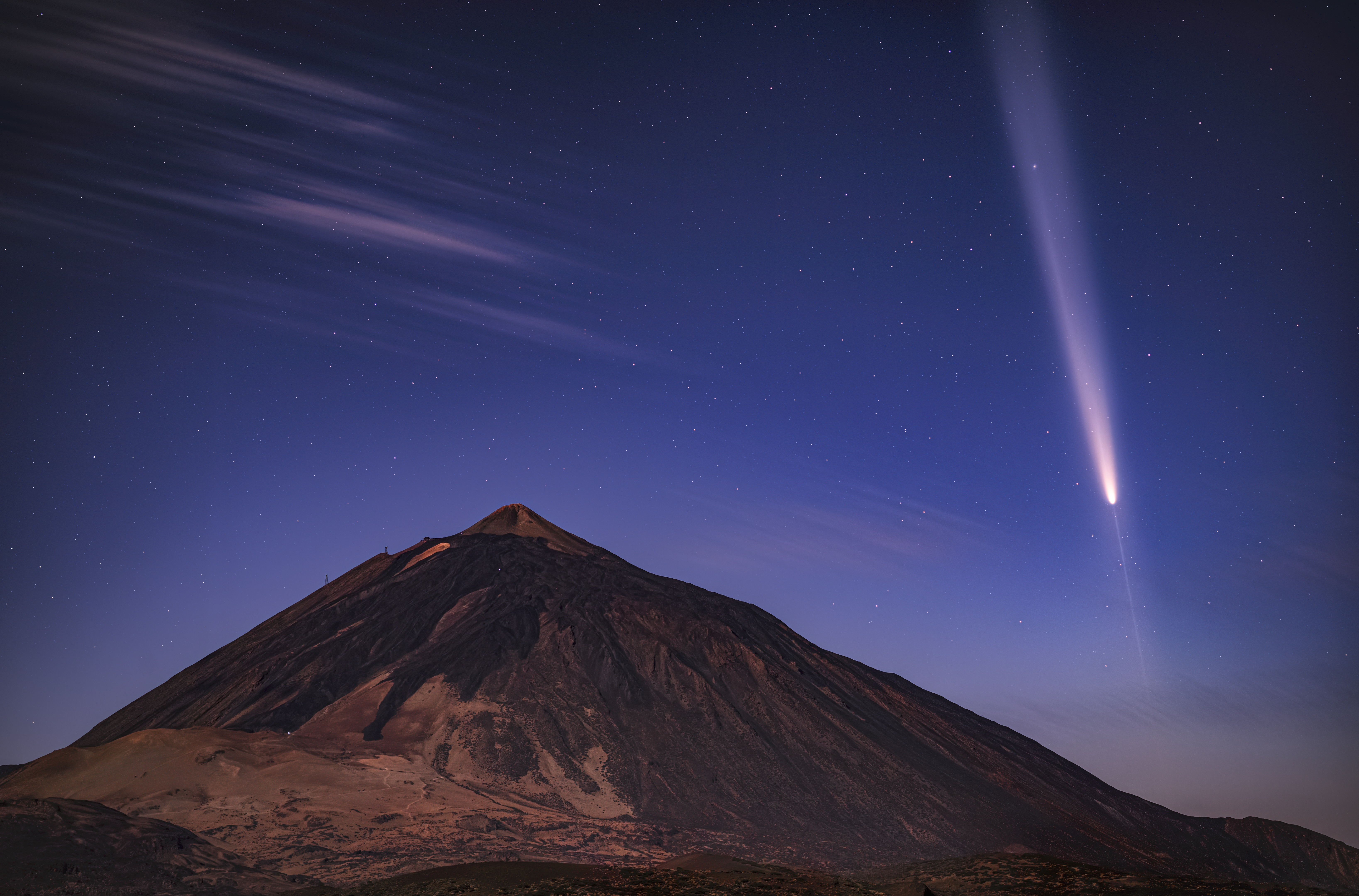 Tal como estaba previsto (aunque con los cometas resulte muy arriesgado apostar nada), el cometa C/2023 A3 comenzó a ser visto de nuevo, esta vez tras las puestas de Sol, el día 12 de octubre, tras su paso entre el Sol y la Tierra. A pesar de un tiempo desapacible e inestable, tuvimos el privilegio de poder observar el cometa por primera vez en este segundo periodo desde el Observatorio del Teide. Era claramente visible a simple vista, a pesar de que el cielo no había alcanzado el ocaso. Este día se ocultaría bastante pronto tras el horizonte oeste, pero nos dio tiempo de presentarlo en directo por televisión.