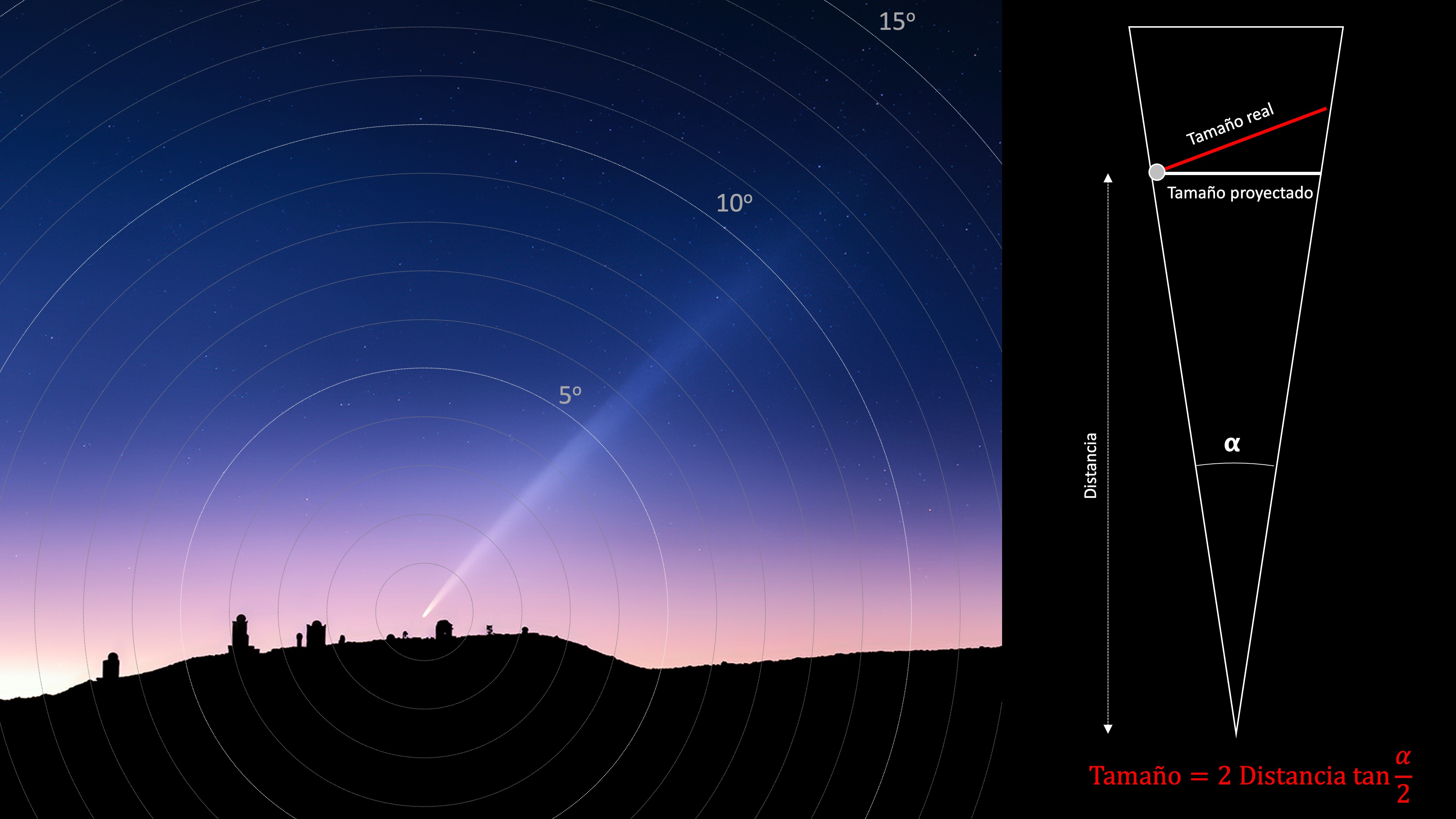 Esa madrugada el cometa estaba situado a unos 113 millones de kilómetros. Con una cola de aproximadamente 14 grados, pudimos estimar su longitud proyectada en alrededor de 28 millones de kilómetros de longitud, seguramente más de 30 millones reales. Eso es más de 2.300 veces el diámetro terrestre, o una distancia que bien merece ser medida en segundos-luz: ¡100 segundos-luz! Un tamaño realmente espectacular si pensamos que son los restos de un bloque de hielo de tan solo una decena de kilómetros de diámetro aproximadamente.