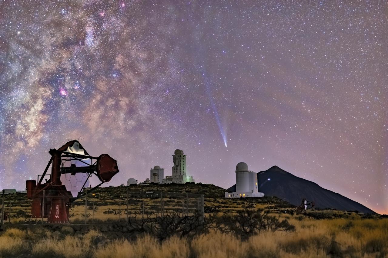 Foto 6: Panorámica del cielo donde se aprecia el Teide y el Observatorio al centro, la isla de la Palma a la derecha y uno de los 9 telescopios ASTRI (cherenkov) a la izquierda, en primer plano. En el cielo es evidente la Vía Láctea (la galaxia en que nos encontramos), así como los dos cometas del momento: C/2025 A6 (Lemmon) y C/2025 R2 (Swan). En los recuadros se muestran los cometas en mayor detalle. Daniel López y Alfred Rosenberg / IAC.