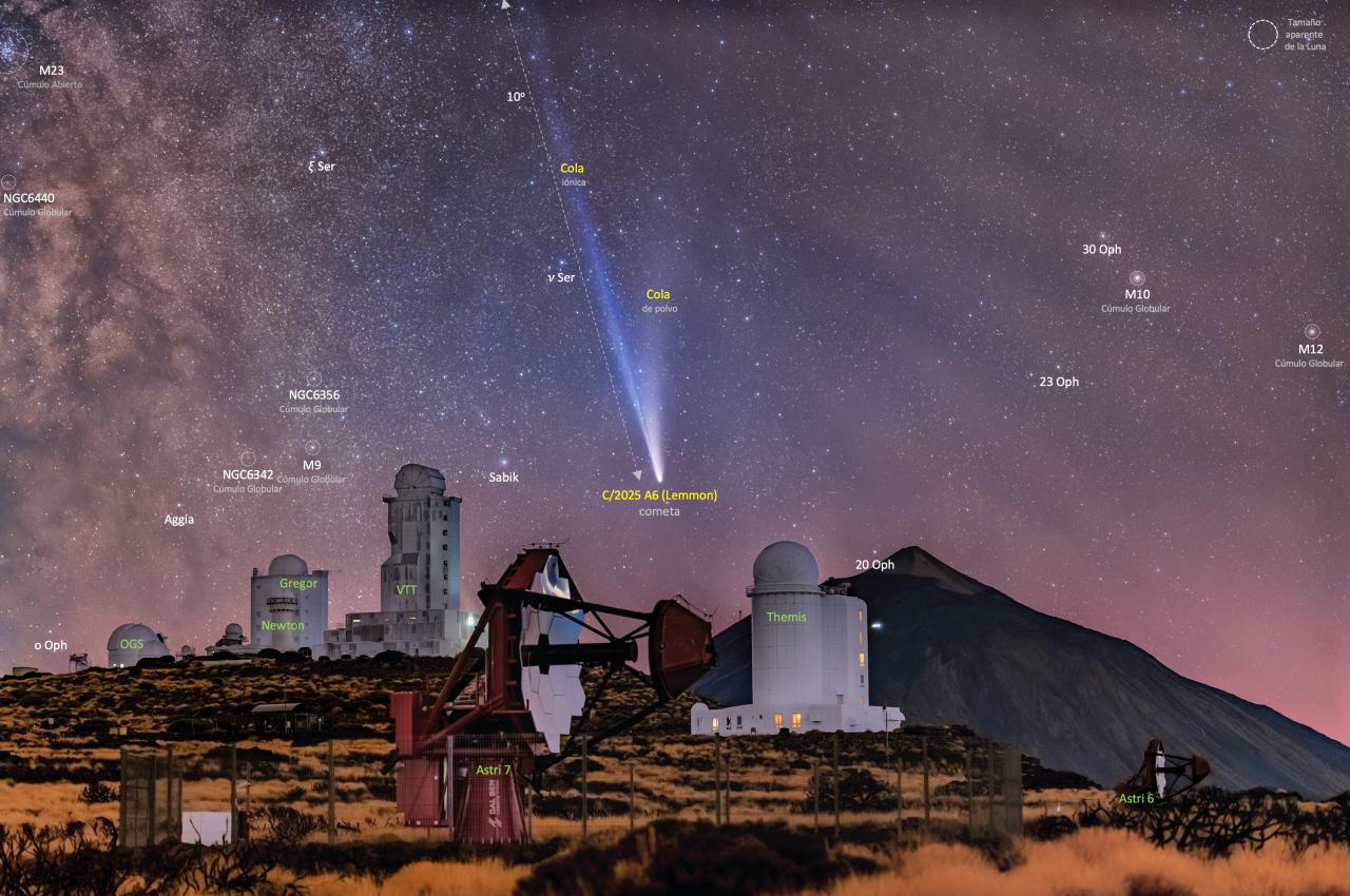 El cometa C/2025 A6 (Lemmon) fue el primero de los dos en ser descubierto (3 de enero de 2025) por Carson Fuls desde Mt. Lemmon (Arizona, EE.UU.) Se trata de un cometa de largo periodo. Se estima que ha tardado más de 700 años desde su posición más lejana en su órbita, allá en la fría nube de Oort, a más de 240 UA (unas 8 veces más distante que Neptuno del Sol) y su paso actual probablemente modifique su órbita acortando este periodo en unas decenas de años. Su tamaño es moderado, estimado entre uno y dos kilómetros de diámetro. Alcanzó el perihelio el 8 de noviembre de 2025 a 0.53 UA del Sol (más cerca que Venus, pero no tanto como Mercurio). Pueden obtener todo tipo de datos, imágenes y gráficos en las páginas de cometografía.es, The Sky Live, Comet Observation Database (COBS) o en la Small-Body Database de la NASA, entre muchas otras.