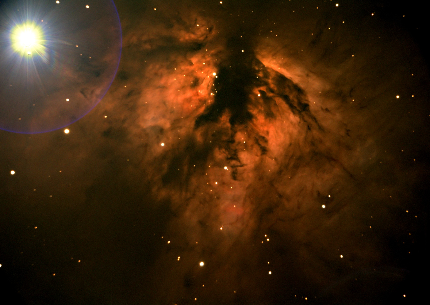 La nebulosa de la Llama, también conocida como nebulosa del Árbol de Navidad o NGC2024, es una región de gas y polvo oscurecido en el Complejo de la Nube Molecular de Orión, región de formación estelar que incluye la famosa nebulosa de la Cabeza del Caballo, situada a 1500 años luz de distancia del Sistema Solar. Esta nebulosa es fácil de localizar dado que se encuentra muy cerca de la estrella brillante que está más a la izquierda en el cinturón de Orión: Alnitak. Esta estrella envía luz energética a la nebulosa de la Llama, lo que hace que se desprendan electrones del gas hidrógeno que reside allí. Gran parte del resplandor se produce cuando se recombinan los electrones y el hidrógeno ionizado.