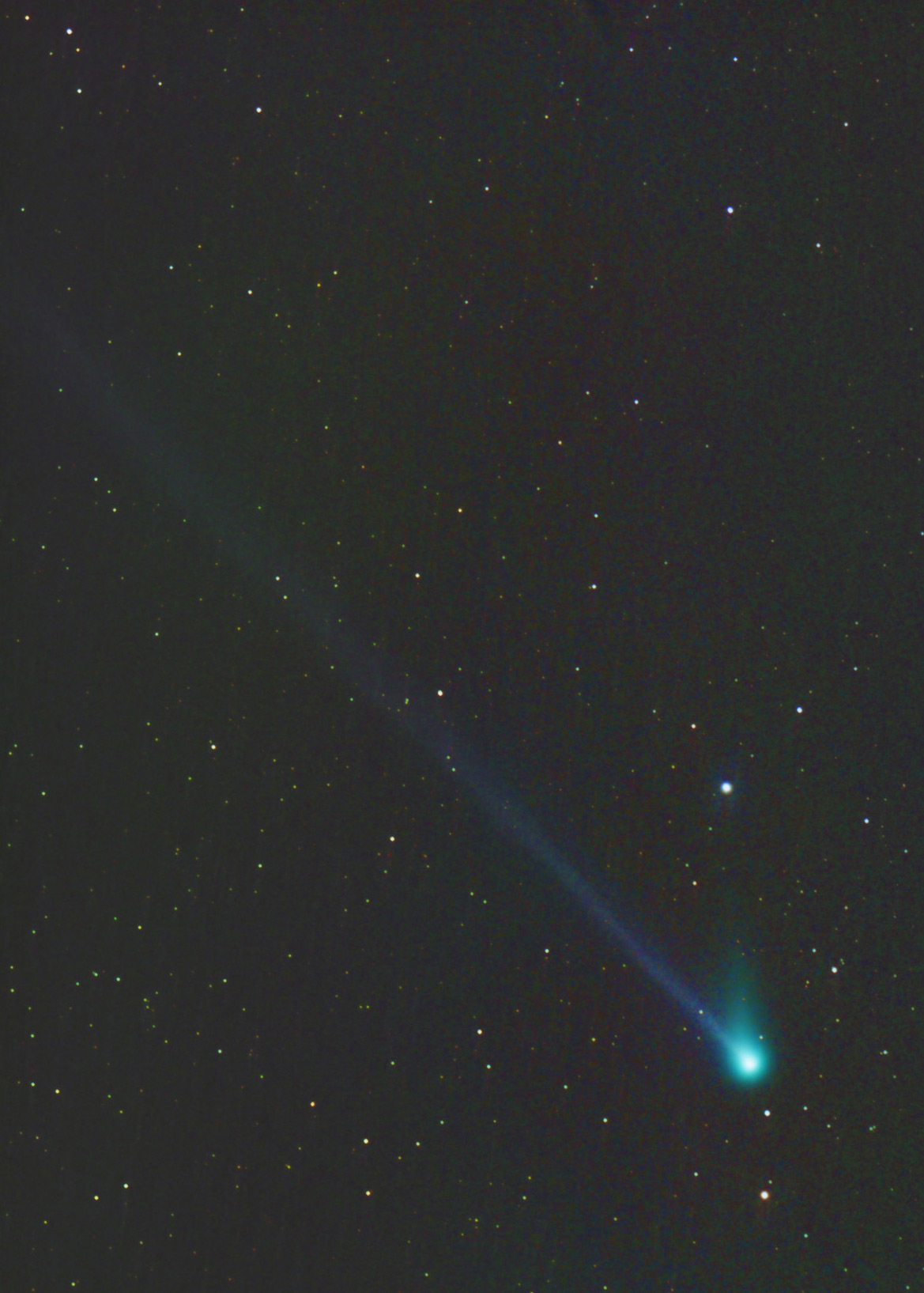 Aunque cada año cientos de cometas visitan el Sistemas Solar interior, muy rara vez brillan lo suficiente como para ser observados con telescopios de aficionado, y mucho menos a simple vista. En septiembre de 2009 el astrónomo Robert McNaught descubrió desde Australia un cometa, su número 54, que acabaría siendo uno de esos privilegiados. El cometa C/2009 R1 (McNaught) alcanzó magnitud visible (magnitud 6, aproximadamente) en junio de este año, llegando hasta algo más brillante que magnitud 4 a principios de julio, en su perihelio, el momento más cercano al Sol, ya inobservable debido a la luz del día. Esta imagen se obtuvo desde el Observatorio del Teide a mediados de junio, cuando brillaba con magnitud 5, muy bajo en el horizonte, poco antes del amanecer. Como se ve, muestra una larga cola de iones de color azul-verdosa producida por partículas de monóxido y dióxido de carbono ionizados y una más pequeña de polvo, que refleja la luz solar. La forma de estas dos colas típicas de los cometas depende de su composición y de la geometría de la órbita. La pequeña cola de polvo, comparada con la de iones que se extendía varios grados en el cielo, indica es un cometa pobre en partículas de polvo.