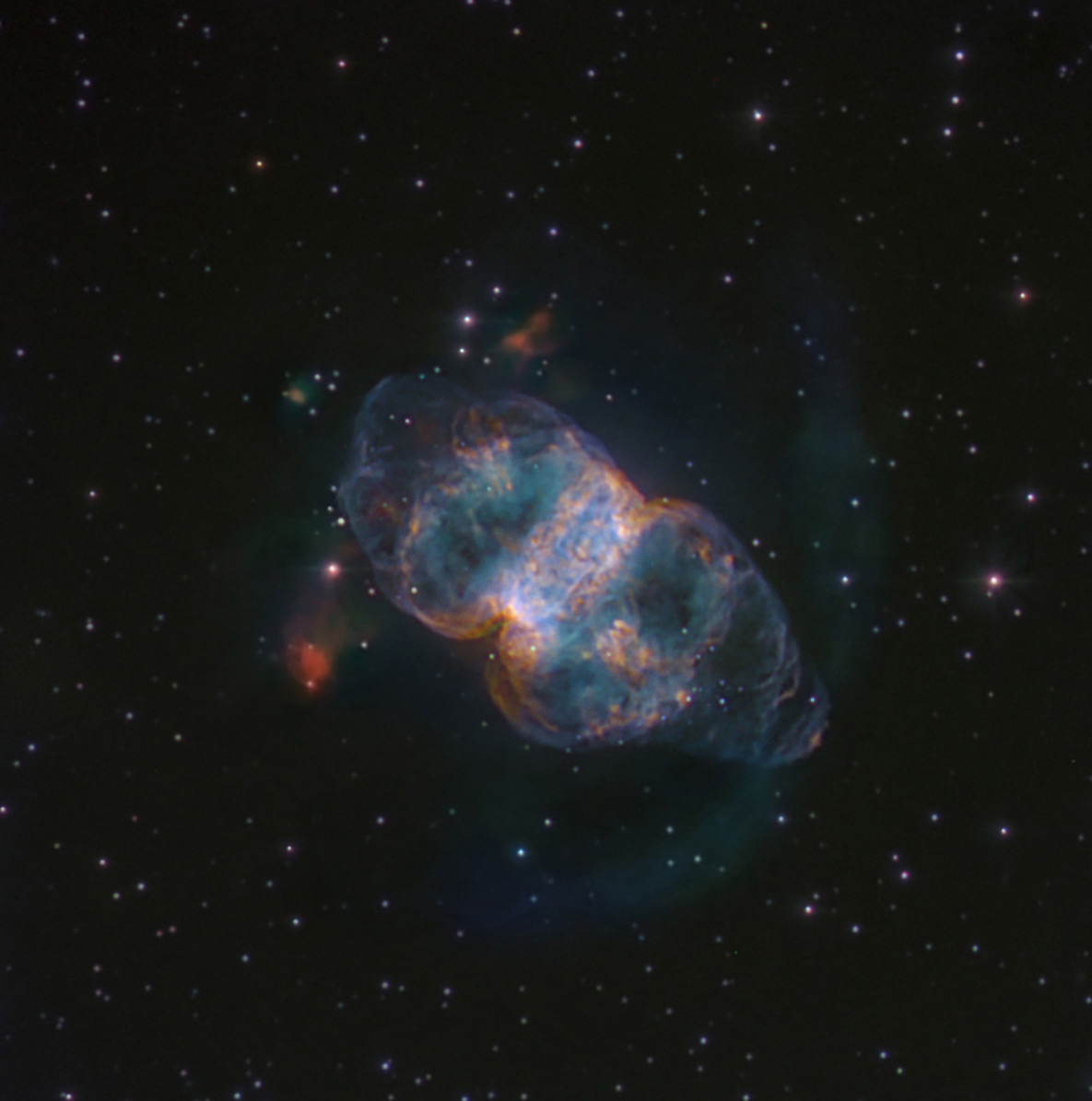 En esta imagen, realizada con el telescopio IAC80 con los filtros de banda estrecha NII-Ha y OIII, pueden distinguirse estructuras difícilmente apreciables en otras fotos publicadas de este objeto. Se pueden apreciar tres ?chorros? de color rojizo, obtenidos con el filtro NII, que surgen en la parte superior de M76, uno pequeño hacia arriba y dos mayores hacia los laterales. Asimismo, puede observarse un halo semicircular azulado que envuelve al objeto en la parte inferior de la imagen, obtenido esta vez con el filtro OIII. Esto da una idea de la riqueza y variedad de la estructura de M76.