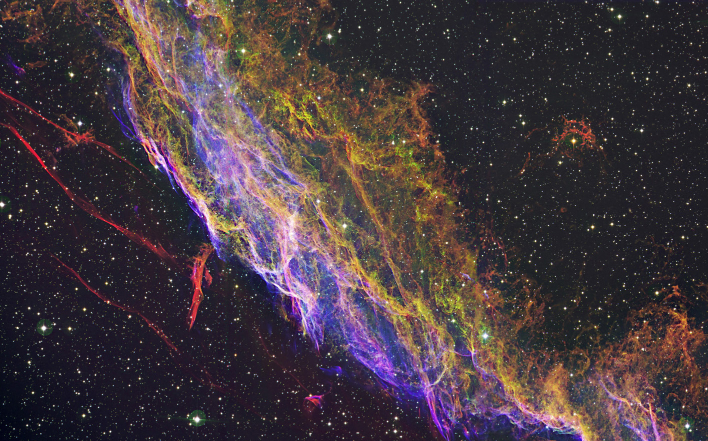 La imagen recoge una parte de la Nebulosa del Velo, también conocida como NGC 6992. Se trata de un remanente de supernova de una estrella supermasiva que explotó en nuestra galaxia hace unos 5.000 años, pudiendo alcanzar entonces una magnitud de -8. Los restos de esta explosión se han ido expandiendo hasta nuestros días, ocupando un área enorme, unos 3 grados cuadrados en el cielo.