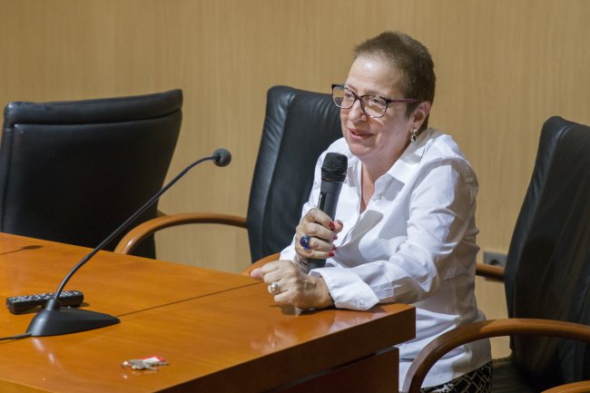 Helena Romero, directora de la obra teatral "El honor perdido de Henrietta Leavitt" y de la compañía Turbo Cultura durante la presentación del proyecto "El regreso de Henrietta Leavitt. De la escuela a la carrera investigadora pasando por el teatro". Crédito: Elena Mora (IAC).