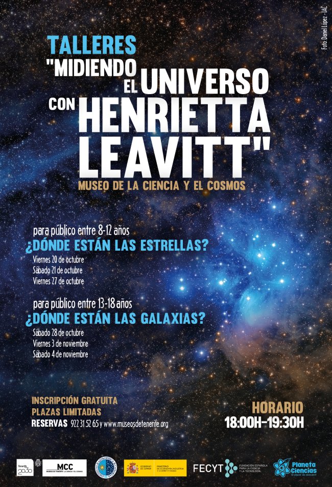 Cartel de los talleres "Midiendo el Universo con Henrietta Leavitt" que tendrán lugar en el Museo de la Ciencia y el Cosmos.