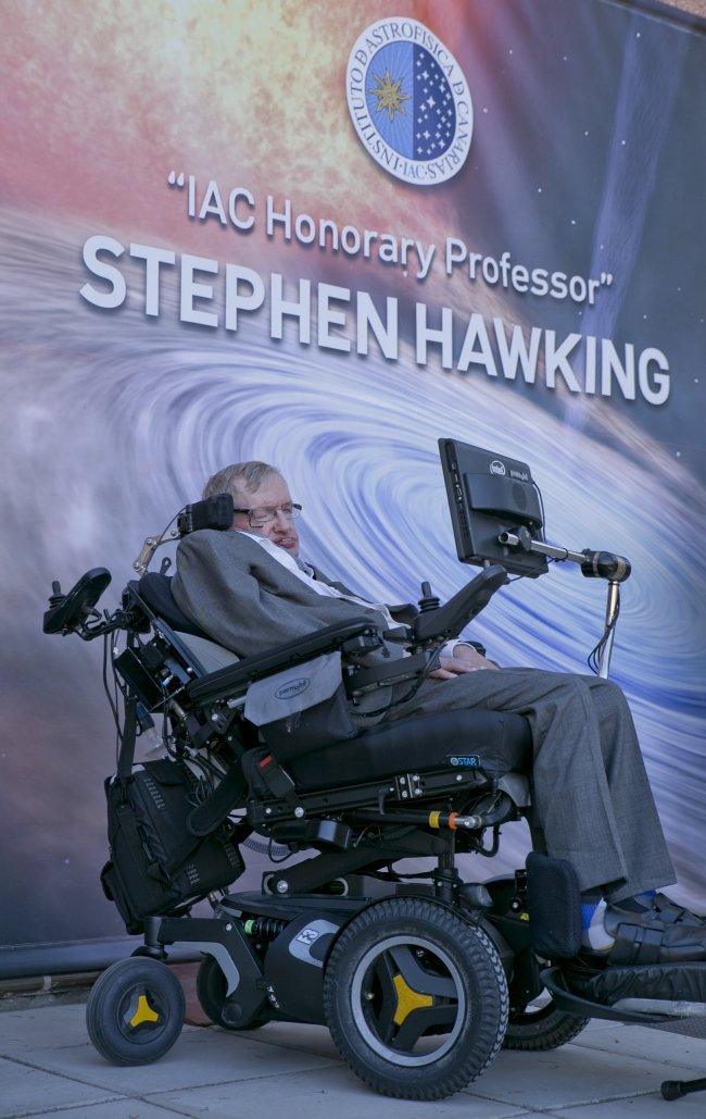 Stephen Hawking en el Instituto de Astrofísica de Canarias (IAC) en 2016 durante su acto de homenaje como "Profesor Honorario del IAC". Crédito: Elena Mora (IAC).