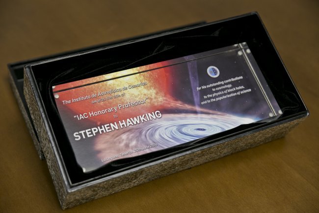 Placa conmemorativa entregada a Stephen Hawking en 2016. Crédito: Elena Mora (IAC).