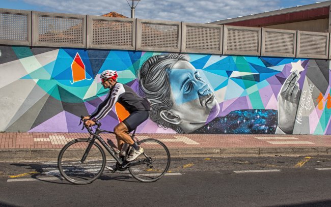 Ciclista pasa por delante del mural en honor a Henrietta Leavitt en Tacoronte. Crédito: Daniel López/IAC.