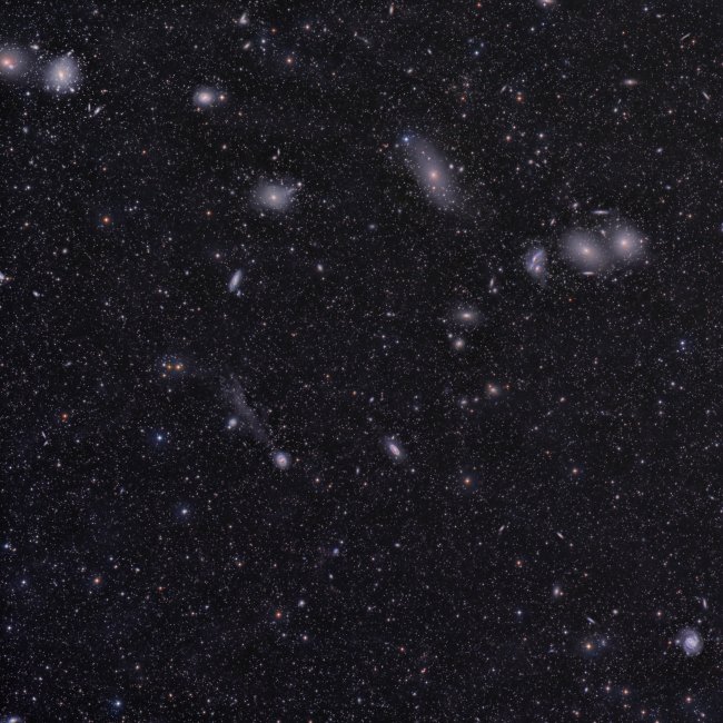 Novena imagen de la exposición "100 Lunas cuadradas" titulada "Cúmulos galácticos. Imagen parcial del Cúmulo de Galaxias de Virgo". La zona del cielo que podemos ver en esta imagen se encuentra próxima al polo galáctico (perpendicular al plano) en la constelación de Virgo. Pueden observarse más de una docena de galaxias con gran detalle (elípticas y espirales), así como identificar visualmente más de 200 galaxias que se encuentran entre 52 y 65 millones de anos luz de distancia. Crédito: Daniel López /IAC.