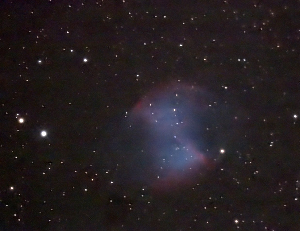 La nebulosa Dumbbell (M27) es una nebulosa planetaria situada a unos 1.240 años luz de distancia de la Tierra. Las nebulosas planetarias reciben este nombre porque al observarlas con un telescopio tienen la apariencia de discos de planetas lejanos. Se producen cuando una estrella parecida a nuestro Sol, pero más vieja, en la fase de gigante roja, expulsa sus capas gaseosas más externas. Después, la estrella se convierte en una enana blanca.