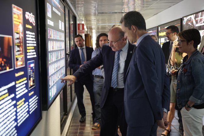 El director del IAC, Rafael Rebolo, muestra al Ministro de Ciencia, Innovación y Universidades, Pedro Duque, uno de los paneles con el personal del IAC. Crédito: Inés Bonet (IAC).