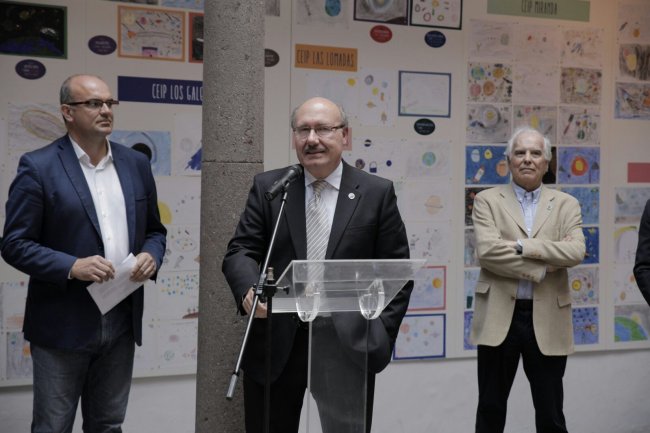 Rafael Rebolo, director del IAC, junto a Anselmo Pestana, presidente del Cabildo de La Palma, y Francisco Sánchez, director fundador del IAC, en el acto de bienvenida a los congresistas de "Preserving the Skies",ayer martes en la Casa Salazar de Santa Cruz de La Palma. Foto: Elena Mora (IAC)