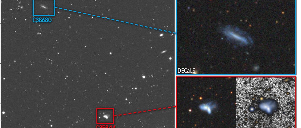 Imagen de un raro par de galaxias enanas en interacción, observado por el proyecto CAVITY. Las dos galaxias protagonistas, CAVITY35843 y CAVITY35844 (recuadro rojo), muestran signos claros de interacción, como núcleos brillantes y colas de marea. También se observa una tercera galaxia, CAVITY38680 (recuadro azul), situada a una gran distancia del par principal y que podría haber desencadenado la fusión. Las imágenes proceden de los telescopios Isaac Newton (INT) y del sondeo DECaLS.