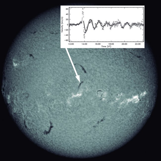 Image of the Sun from GONG telescopes network in Hα filter. Prominences are seen as dark filaments over the solar disk. The arrow indicates a prominence that oscillates. The diagram shows the horizontal velocity of the prominence. In the first phase of the oscillations, the velocity reaches the 60 km/s. The periodic motion persists during several hours. Credit: Manuel Luna (IAC).