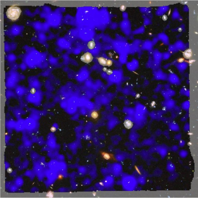 Deep observations made with the MUSE spectrograph on ESO’s Very Large Telescope have uncovered vast cosmic reservoirs of atomic hydrogen surrounding distant galaxies. The exquisite sensitivity of MUSE allowed for direct observations of dim clouds of hydrogen glowing with Lyman-alpha emission in the early Universe — revealing that almost the whole night sky is invisibly aglow. Credit:ESA/Hubble & NASA, ESO/ Lutz Wisotzki et al.