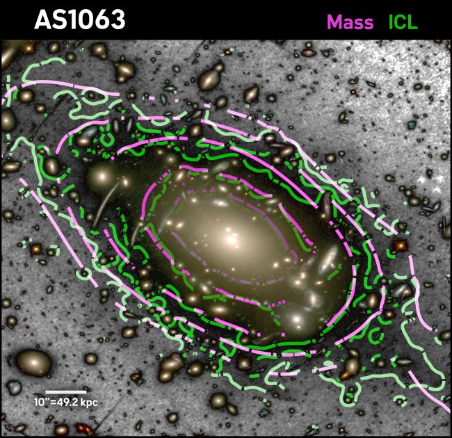 Image of the cluster of galalxies Abell S1063, at a distance of 4,000 million light years from Earth. Superposed on the image can be seen the contours of the distribnution of dark matter (in violet) and the distribution of the weak intracluster light (in green9. The two sets of contours are distributed similarly. Credit: Gabriel Pérez Díaz (SMM, IAC).