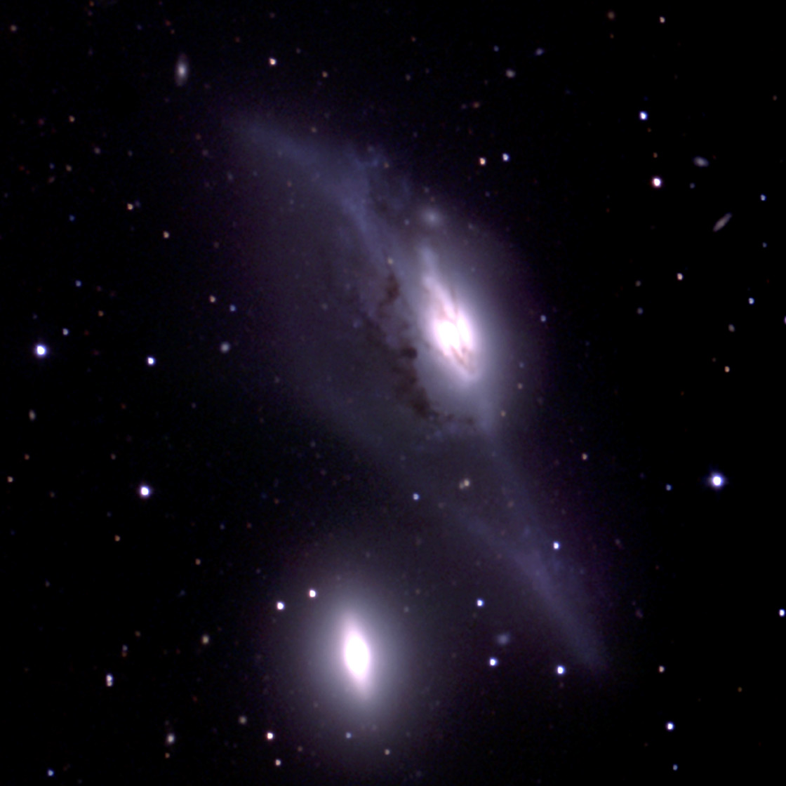 También conocidas como \\"Los Ojos\\", las galaxias NGC4435 y NGC4438 se clasifican como un par de galaxias en colisión. La mayor de ellas, NGC4438, es una galaxia espiral, mientras que NGC4435 -la más pequeña- es de tipo lenticular. Ambas galaxias pertenecen al cúmulo de Virgo y se encuentran a una distancia en torno a 40 millones de años luz. En la foto puede apreciarse cómo \\"estelas\\" de los brazos de NGC4438 parecen estar siendo atraidas hacia su compañera. Además, en NGC4438 se aprecian bandas oscuras cerca del núcleo debido a la presencia de polvo que está bloqueando la luz emitida por la galaxia. También se observa que los núcleos de ambas galaxias están más amarillos que las zonas externas debido a que las estrellas más viejas están cerca del centro, mientras que las más jóvenes (estrellas azuladas) están en las afueras. Es obvio que NGC4438 está interaccionando y, posiblemente, fusionándose con la otra galaxia. Sin embargo, NGC4435 -a pesar de encontrarse prácticamente a la misma distancia- parece no estar afectada por esa interacción de galaxias, lo cual constituye otro de tantos \\"misterios astronómicos\\".