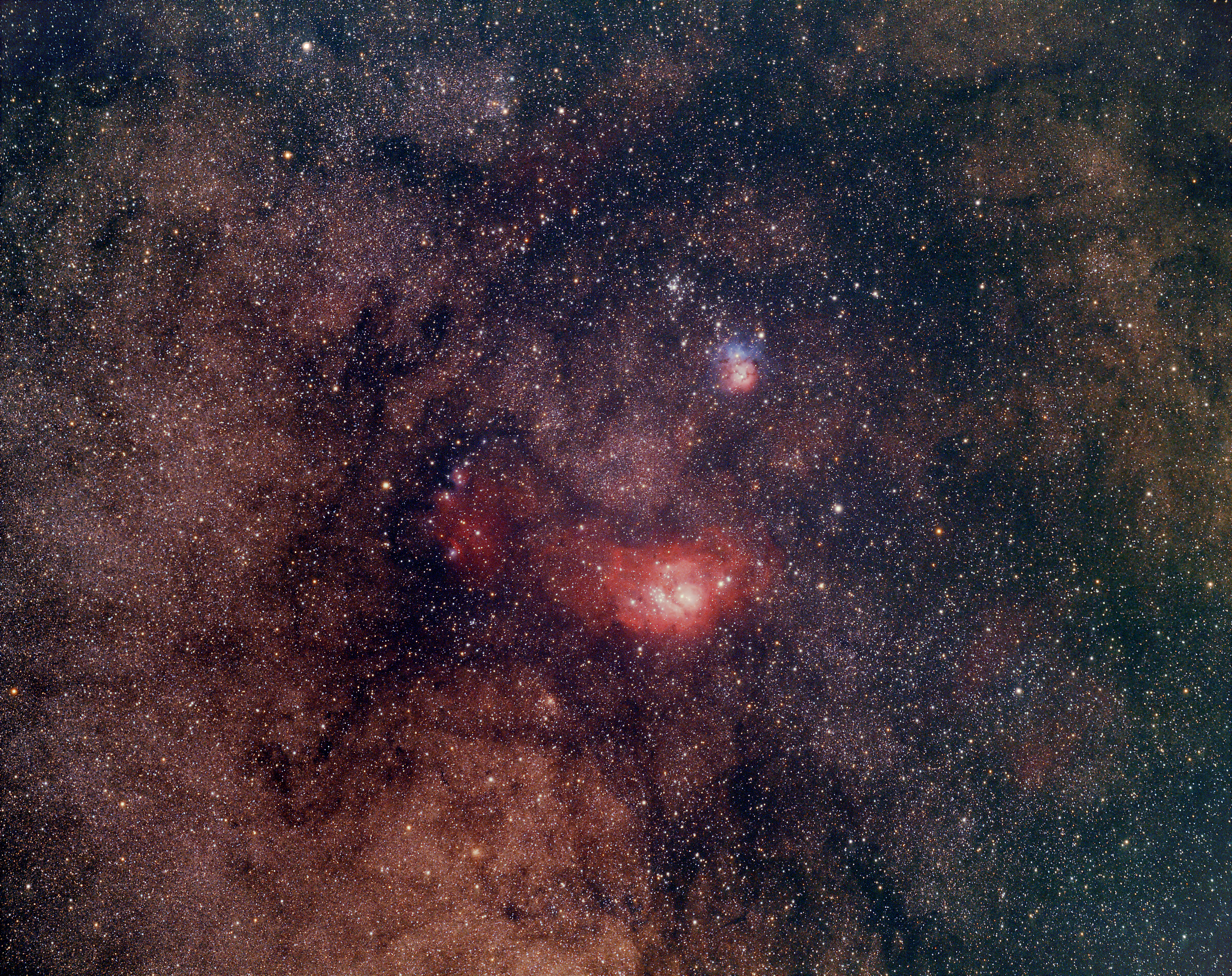 The Lagoon is the larger nebula at the bottom. The red color arises mainly from hydrogen gas. The smaller Trifid at the top is also an emission nebula, but it has reflection components, which are regions of sparse fine dust that reflect the blue light of the stars. The dark veins in the Trifid are related lanes of cool gas in the foreground.