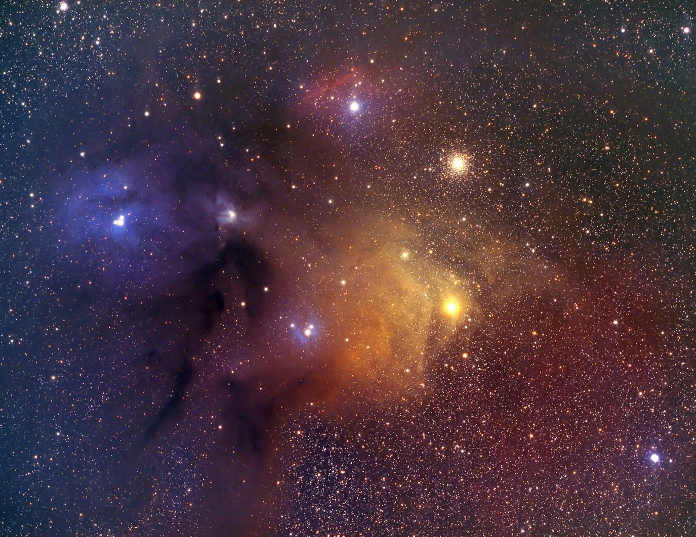 La región de nebulosas cercanas a la estrella Antares, en la constelación de Escorpio, es una de las más bellas del cielo tanto por su colorido como por las formas inusuales que presenta. Entre todas, destacan las regiones de polvo entre Ofiuco y Escorpio por el espectacular y llamativo colorido, difícil de encontrar en otras zonas del cielo. Casi en el centro de la imagen se distingue, con un color amarillento, la supergigante roja Antares. Esta estrella tiene un radio de unas 700 veces el del Sol, de manera que, si estuviese en su lugar, ocuparía un espacio superior a la orbita de Júpiter. Justo debajo de Antares se sitúa el cúmulo globular M4, que en realidad se encuentra más alejado de nosotros que las nebulosas de su alrededor, aunque podamos verlo a través de ellas. En la parte superior izquierda de la imagen, y partiendo desde las nebulosas próximas a Antares, surgen los llamados ?Ríos Oscuros?, provocados por polvo que oscurece las estrellas lejanas.