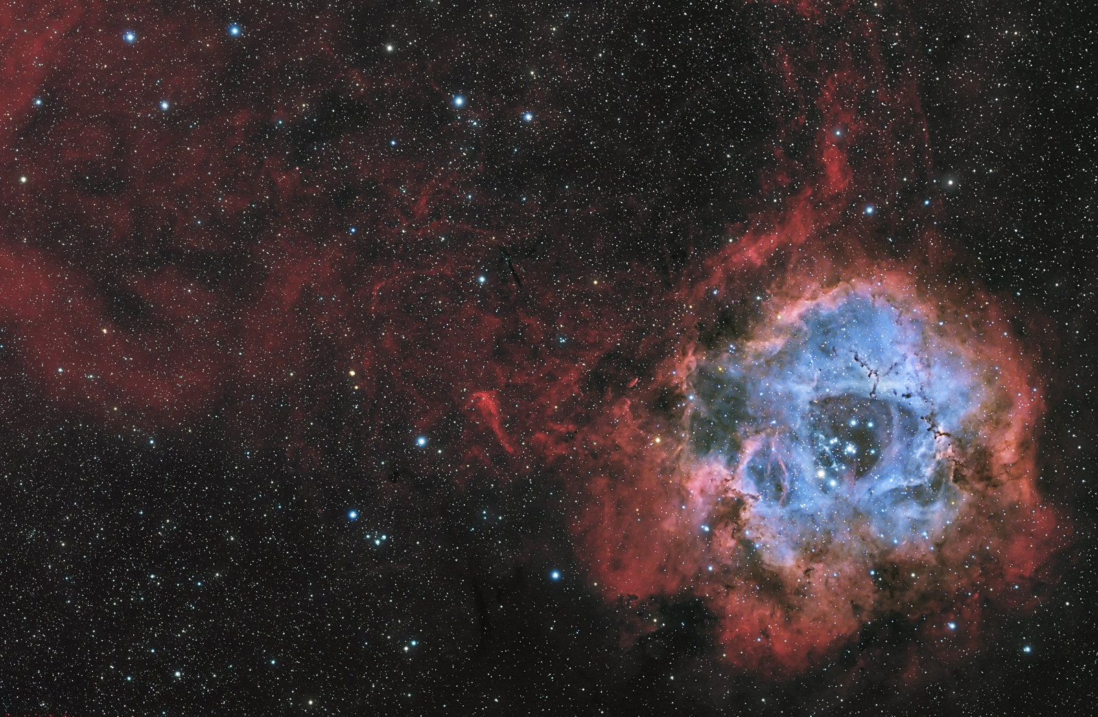 El destino de las nebulosas lo escribe su propia descendencia. Son los vientos y la radiación procedentes de las estrellas jóvenes, masivas y calientes que se forman en el interior de las nebulosas los responsables de disipar el gas y el polvo natal del centro de la región de formación de estrellas. Y la Nebulosa Roseta (NGC 2237) no iba a ser una excepción. Situada a unos 5000 años luz de la Tierra, en el borde de una gran nube molecular en la constelación de Monoceros (unicornio, en griego), la intensa radiación de alta energía, principalmente de las estrellas de tipo O y B, está tallando una cavidad central, que puede distinguirse claramente como una región interna azul en la IAM de este mes. Las estrellas de este joven cúmulo, catalogado como NGC 2244, solo tienen unos pocos millones de años de edad, mientras que el agujero central de la nebulosa mide unos 50 años luz de diámetro. El viento de partículas que fluye de las estrellas del cúmulo también es responsable de los filamentos de gas y polvo que pueden observarse en la imagen.