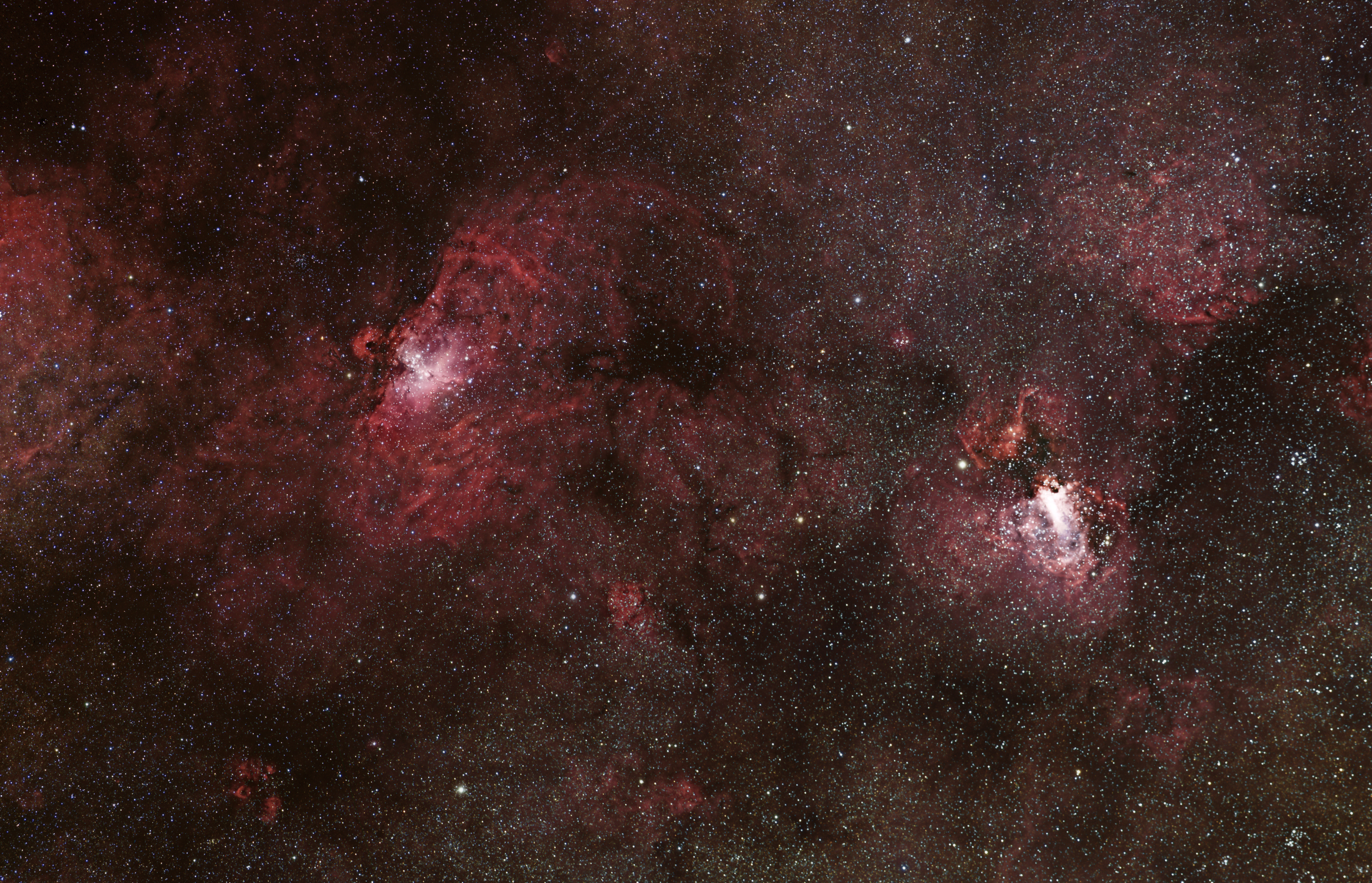 En la enorme porción de cielo que cubre esta imagen, unos seis grados en diagonal, vemos dos de las más brillantes nebulosas de emisión o regiones H II de nuestra galaxia. La nebulosa del Águila, a unos 7000 años luz en la constelación de Serpers (la serpiente), a la izquierda de la imagen, es una zona de formación estelar muy activa y su parte central, donde el gas forma una estructura en forma de columnas o pilares, es una de las mejor estudiadas en la galaxia. Gracias a las observaciones con el telescopio espacial Hubble en 1995 se conoce mucho mejor cómo ocurre la formación estelar en estas regiones.