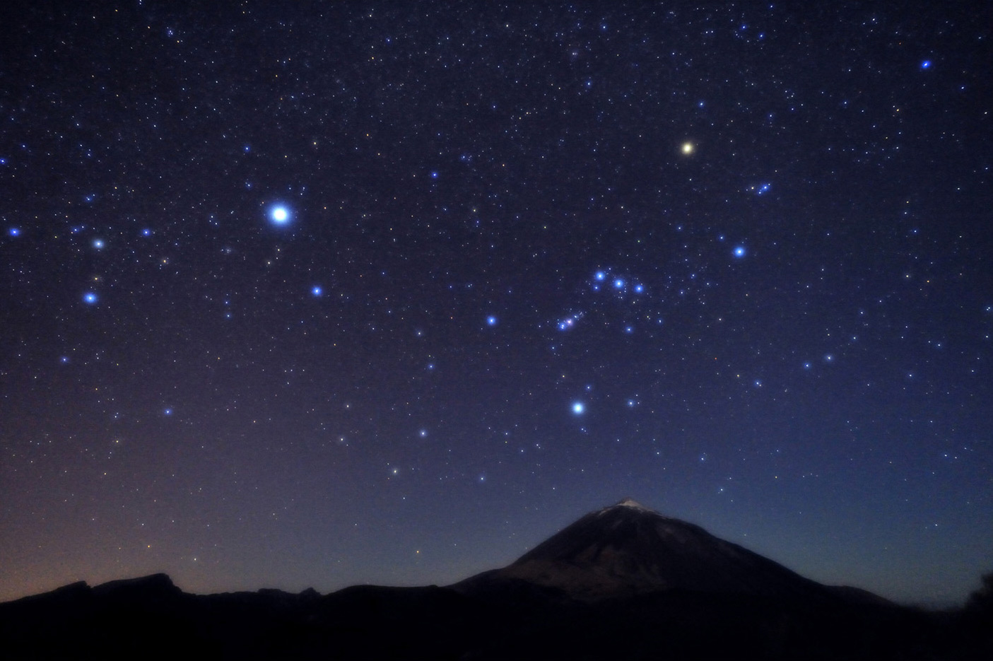 La constelación de Orión, el cazador, es una de las más impresionantes del cielo, así como una de las más fácilmente localizables. Con numerosos objetos de gran belleza en su interior, a simple vista destacan la estrella Betelgeuse, de color rojo, el famoso cinturón de Orión con las tres maría: Mintaka, Alnilam y Alnitak y, bajo el cinturón, Rigel, otra de las estrellas más llamativas del cielo. A la izquierda de Orión podemos ver el Can Mayor, siguiendo siempre en su recorrido nocturno al cazador. En esta constelación destaca sobre todo lo demás la estrella Sirio, la más brillante del cielo nocturno, con un brillo sólo superado por la Luna, Venus, Júpiter y Marte.