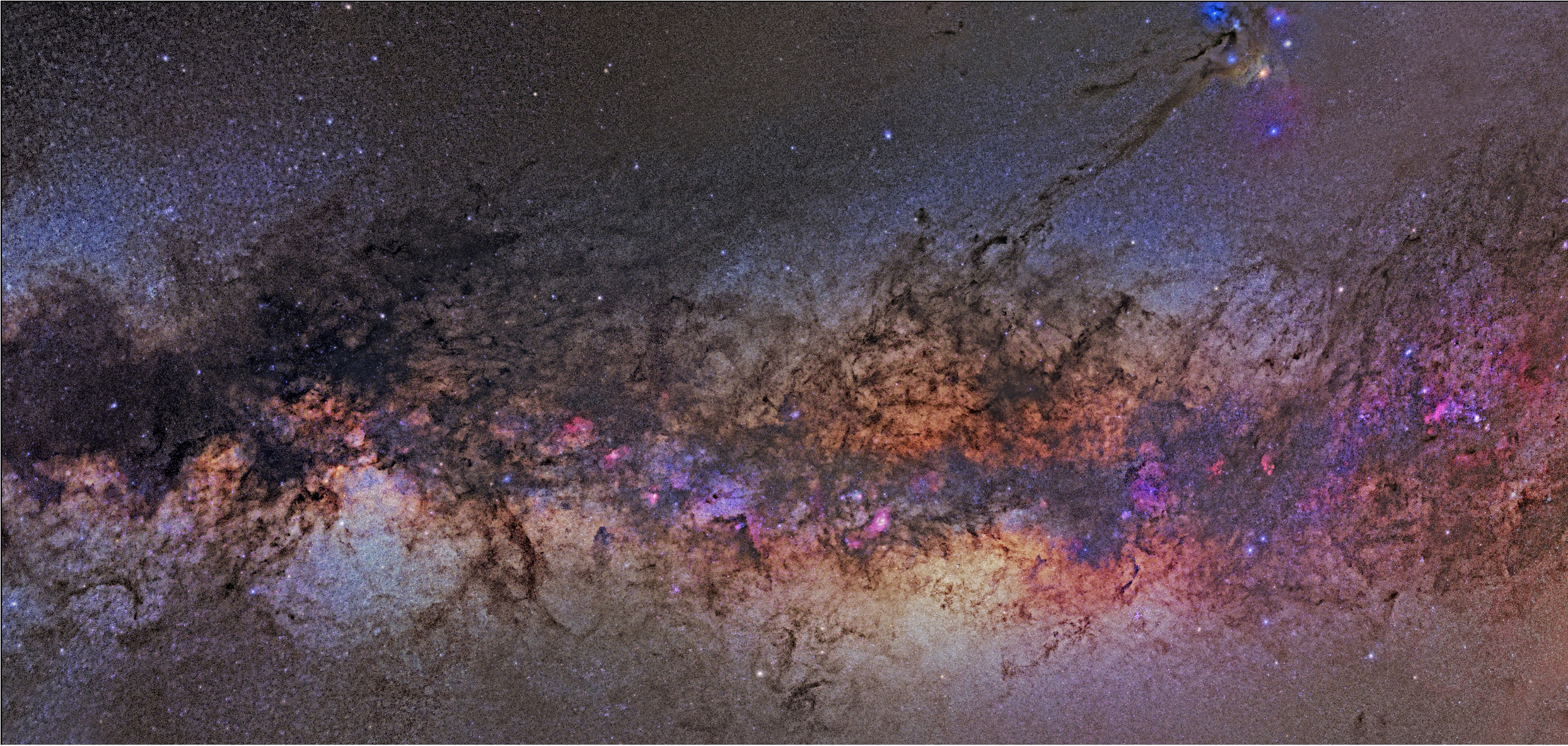 Fotografía de la Vía Láctea en su zona central compuesta por un mosaico de 15 teselas y cada una compuesta a su vez por 5 imágenes de 10 minutos de exposición. Cada imagen RAW se procesó y se combinó con Photoshop. Las 15 partes del mosaico se ensamblaron con el programa gratuito Hugin y el enorme archivo resultante se trató con el programa Photoshop CS4.
