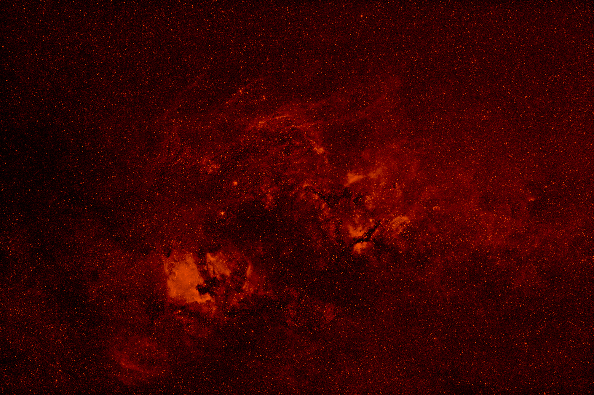 A region of our galaxy rich in dust and gas, the Milky Way, surrounding the brightest star in the Cygnus constellation, Deneb (alpha Cygni). Deneb is slightly to the left of centre in the image. This photograph was obtained with a narrow band h alpha filter and shows the large quantity of ionised hydrogen in this region. The North America Nebula (NGC7000) and the Pelican Nebula (IC5070) can be easily identified just beneath Deneb. An immense dark nebula known as the Northern Coalsack, which extends downwards and to the right from Deneb, is also visible. Other highlights include the Crescent Nebula (NGC6888), shaped like a peanut or cocoon, which can be seen halfway between the centre and the right hand edge of this wide field capture. Source: Astronomy Picture of the Month