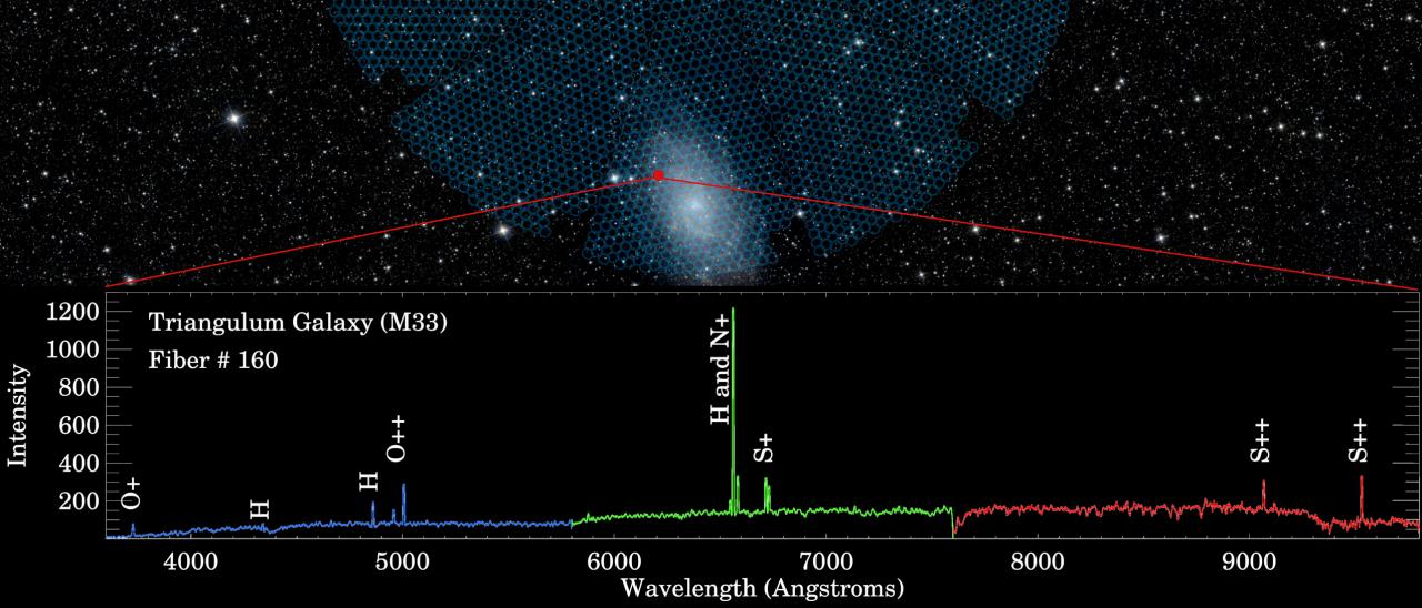 DESI's first spectrum. Crédito: DESI Collaboration; Legacy Surveys; NASA/JPL-Caltech/UCLA Created at 10/29/2019 Astrophysics Technology Visible instrumentation
