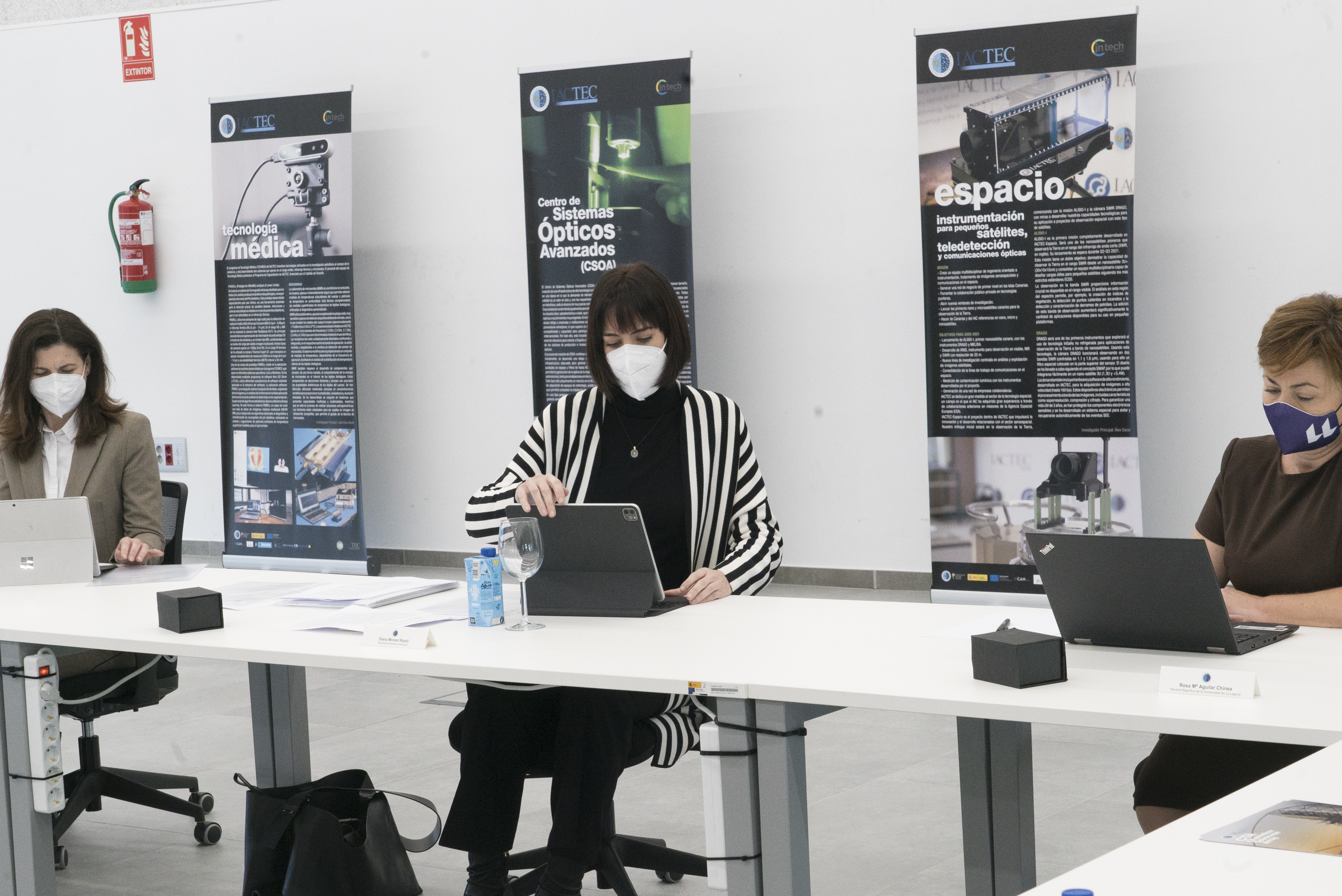 Raquel Yotti, secretaria General de Investigación, Diana Morant, ministra de Ciencia e Innovación; y Rosa Mª Aguilar, rectora de la Universidad de La Laguna, en el Consejo Rector 2021 del IAC, celebrado en la sede de IACTEC en La Laguna. Crédito. Inés Bonet Márquez (IAC).