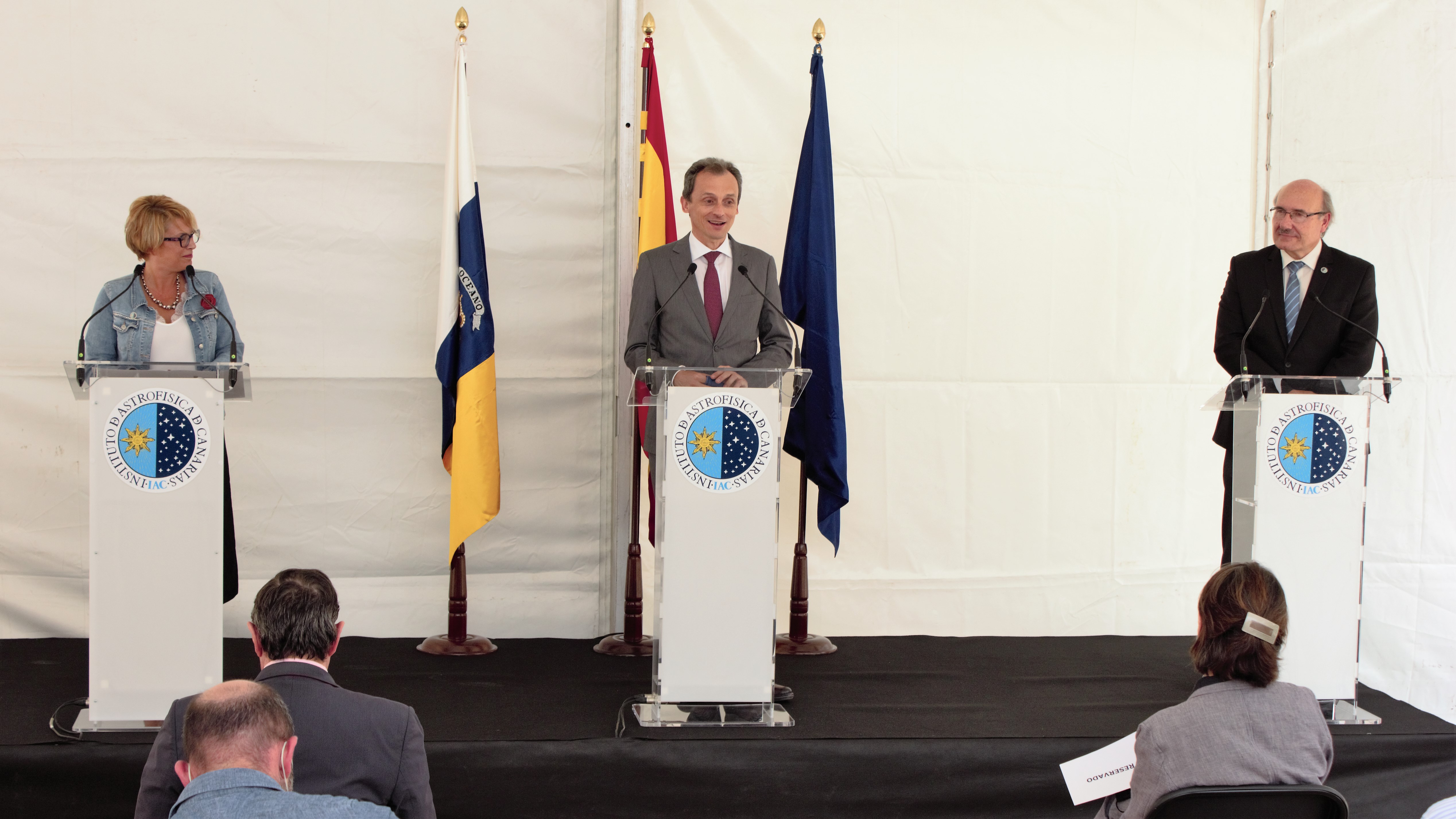 Elena Máñez, Head of the Department of Economy, Knowledge and Employment of the Canary Government, Pedro Duque, Minister of Science and Innovation, and Rafael Rebolo, Director of the IAC, in the Press conference after the Governing Council meeting (2020). Credit: Iván Jiménez Montalvo (IAC).