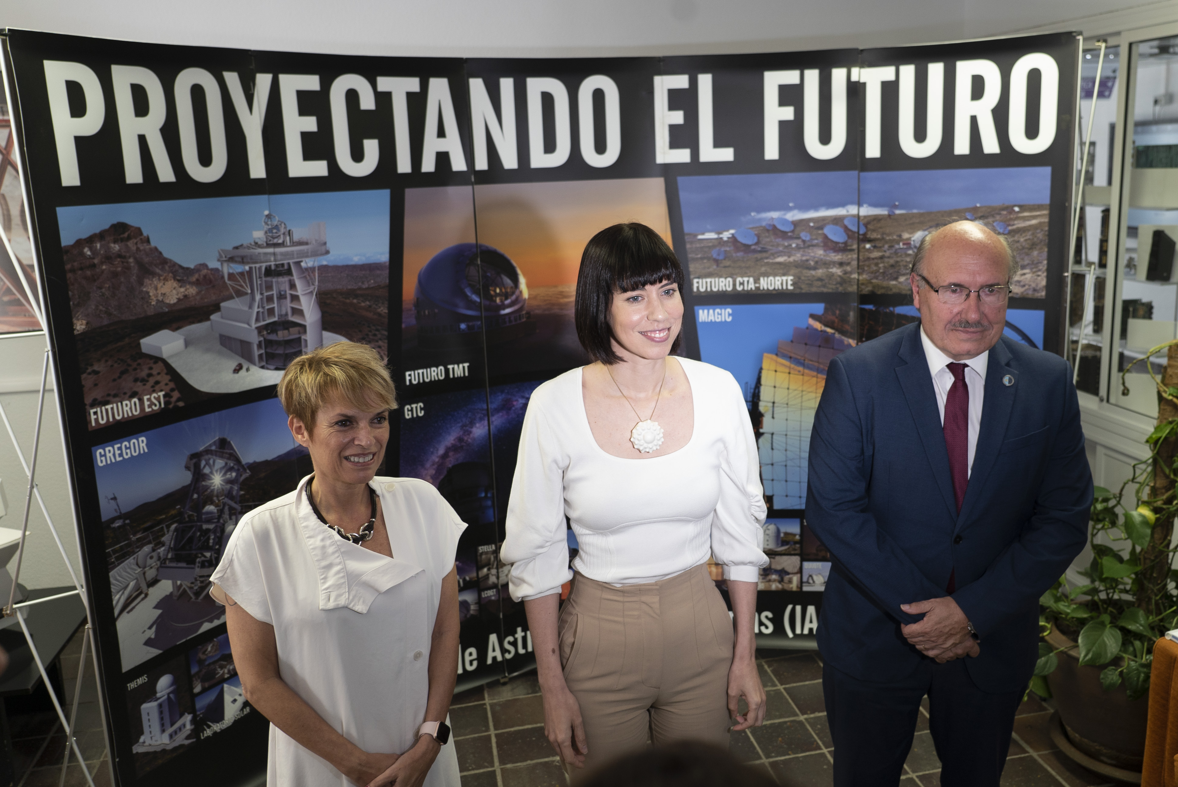 Media attention after the IAC Governing Council. From left to right: Elena Máñez, Regional Minister of Economy, Knowledge and Employment of the Government of the Canary Islands, Diana Morant, Minister for Science and Innovation, and Rafael Rebolo, Director of the IAC. Credit: Inés Bonet (IAC).