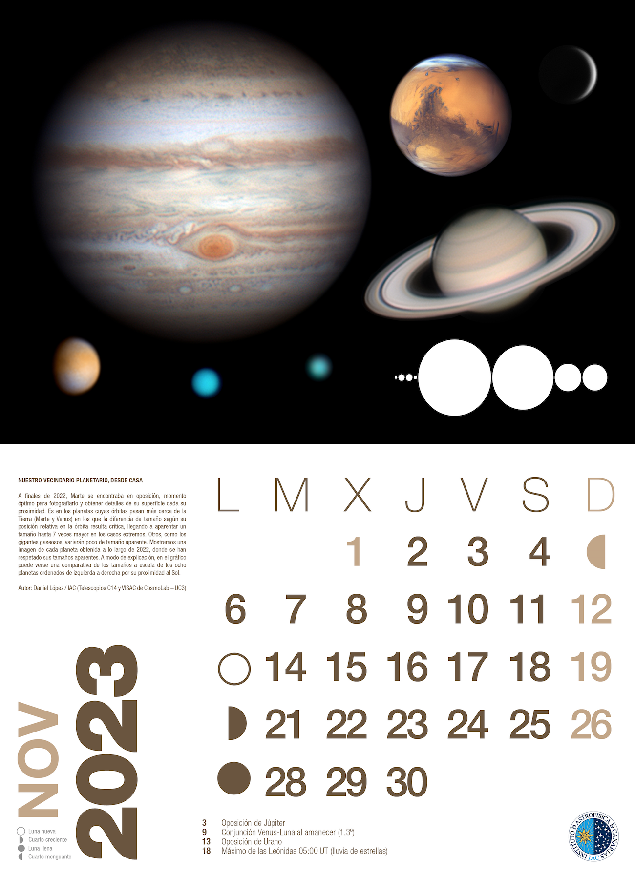 At the end of 2022, Mars was at opposition, an optimal time to photograph it and obtain details of its surface given its proximity. It is the planets whose orbits pass closest to the Earth (Mars and Venus) where the difference in size depending on their relative position in the orbit is critical, appearing up to 7 times larger in extreme cases. Others, such as the gas giants, will vary little in apparent size. We show an image of each planet obtained over the course of 2022, where their apparent sizes have been respected. By way of explanation, the graph shows a comparison of the scaled sizes of the eight planets ordered from left to right by their proximity to the Sun.