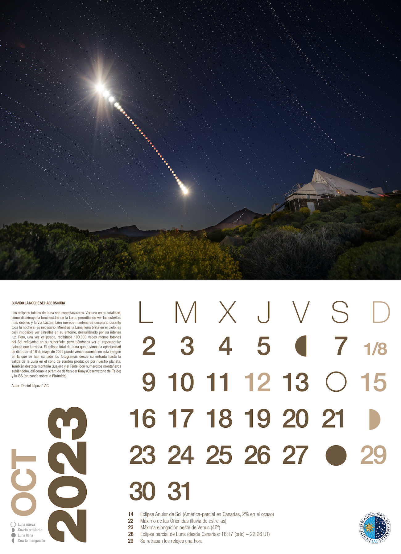 Total lunar eclipses are spectacular. Seeing one in its totality, as the Moon's luminosity diminishes, allowing the faintest stars and the Milky Way to be seen, is well worth staying awake all night if necessary. While the full Moon shines brightly in the sky, it is almost impossible to see stars around it, dazzled by its intense light. But, once eclipsed, we receive 100,000 times fewer photons from the Sun reflected from its surface, allowing us to see the spectacular scenery around it. The total lunar eclipse that we had the opportunity to enjoy on 16 May 2022 can be seen summarised in this image in which the frames from the entrance to the exit of the Moon in the cone of shadow produced by our planet have been added together. The Guajara mountain and the Teide (with numerous mountaineers climbing it) also stand out, as well as the Van der Raay pyramid (Teide Observatory) and the ISS (crossing over the Pyramid).