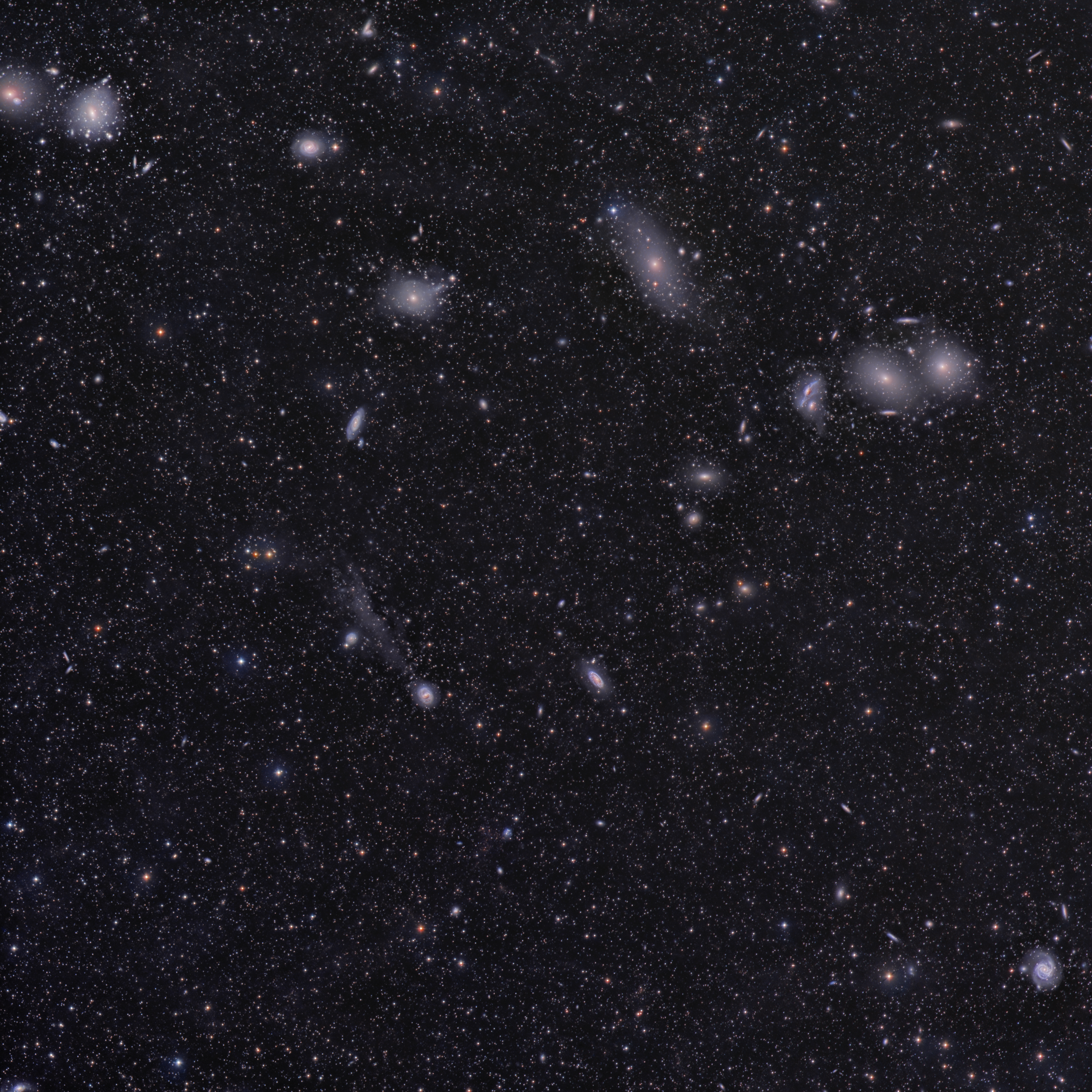 In the first six images of this exhibition there are hardly any galaxies, since we are located inside the Milky Way, practically in the plane of its disk and halfway between its nucleus and the outer edge. When we look near the galactic plane, the stars, dust and gas that make it up prevent us from seeing objects further away. However, as we look up at this plane, we find places free of obstacles that allow us to enjoy the most distant Universe. The zone of the sky that we can see in this image is near the galactic pole (perpendicular to the plane) in the constellation of Virgo. More than a dozen galaxies can be observed in great detail (elliptical and spirals), as well as visually identifying more than 200 galaxies, marked with small circles. The 18 tagged galaxies are part of the Virgo Cluster, whose total extension exceeds the margins of this image, as it covers an arc of more than eight degrees. All are between 52 and 65 million a.l. away. The subgroup formed by M84, M86, NGC4477, NGC4473, NGC4461, NGC4458, NGC4438 and NGC4435 is known as the "Markarian Chain", all these galaxies sharing a common motion.