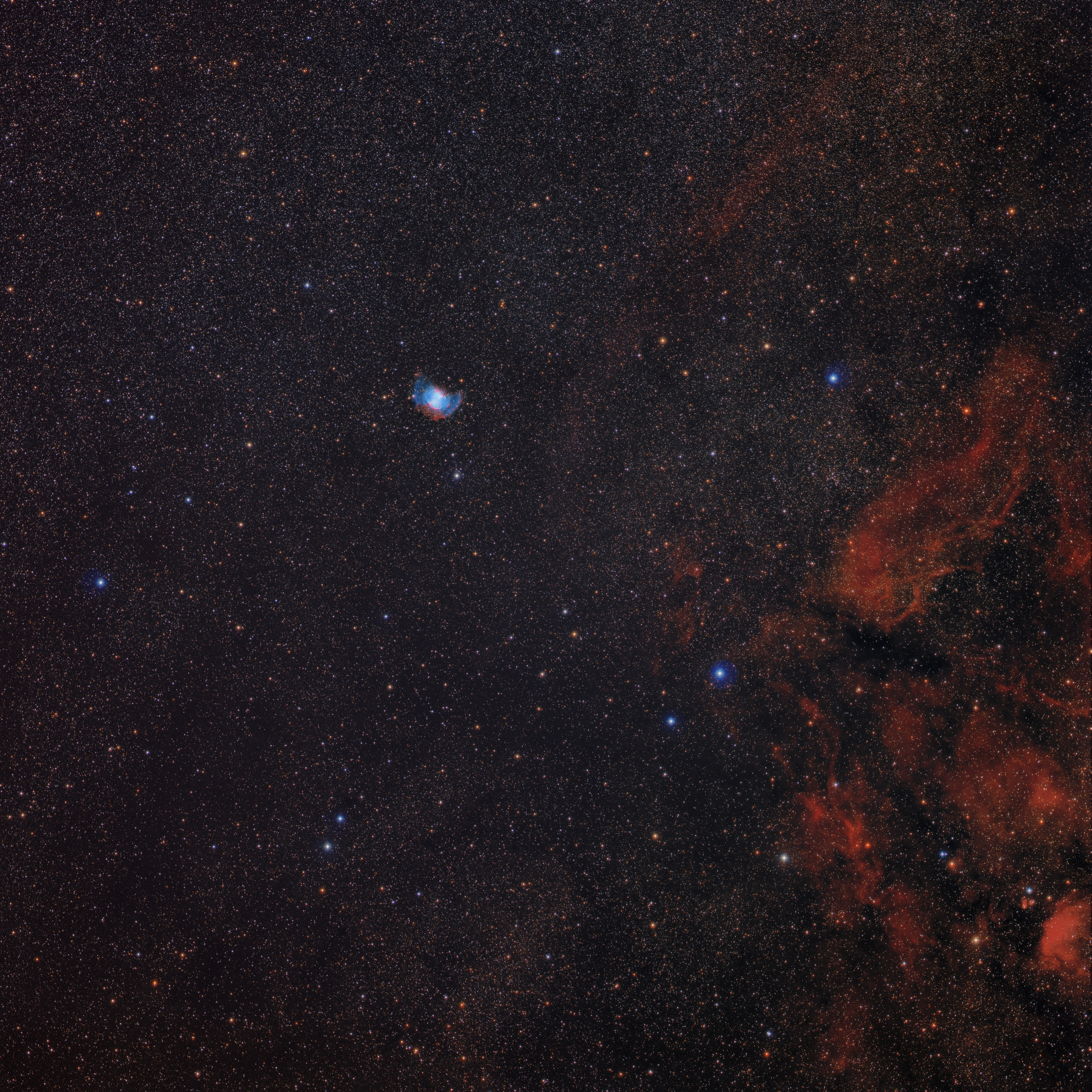 The image is the result of adding 8 exposures of 600s in each of the 3 wide filters R(red), G(green) and B(blue); plus 12 exposures of 1,800s in each of the 3 narrow filters Hα, SII and OIII; and 21 exposures in the L(luminance) filter with the Sky Treasure Chest Astragraph (STC) of the UC3. Author: D. López ©IAC