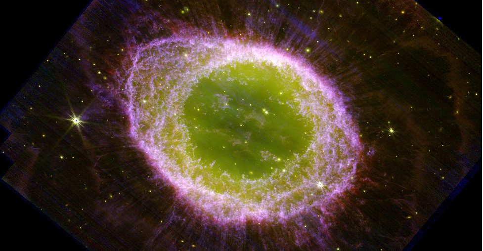 JWST/NIRcam composite image of the Ring Nebula. The image clearly shows the main ring, surrounded by a faint halo and with many delicate structures. The interior of the ring is filled with hot gas. The star which ejected all this material is visible at the very centre. It is extremely hot, with a temperature in excess of 100,000 degrees. The nebula was ejected only about 4000 years ago. Technical details: The image was obtained with JWST's NIRCam instrument on August 4, 2022. Images in three different filters were combined to create this composite image: F212N (blue); F300M (green); and F335M (red).