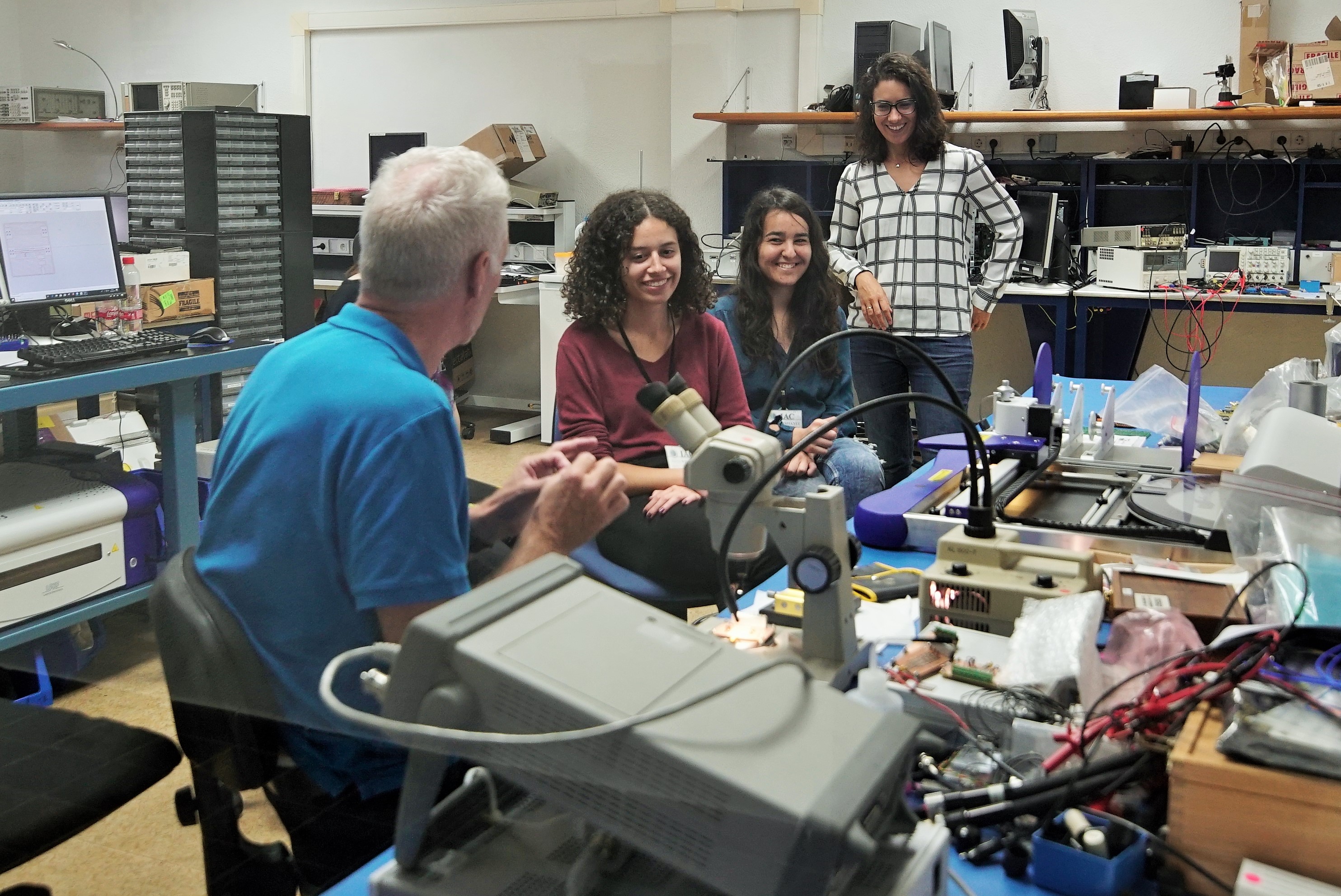 Roger Hoyland in the instrumentation laboratories of the IAC with the students of the Canarias Masterclass program.