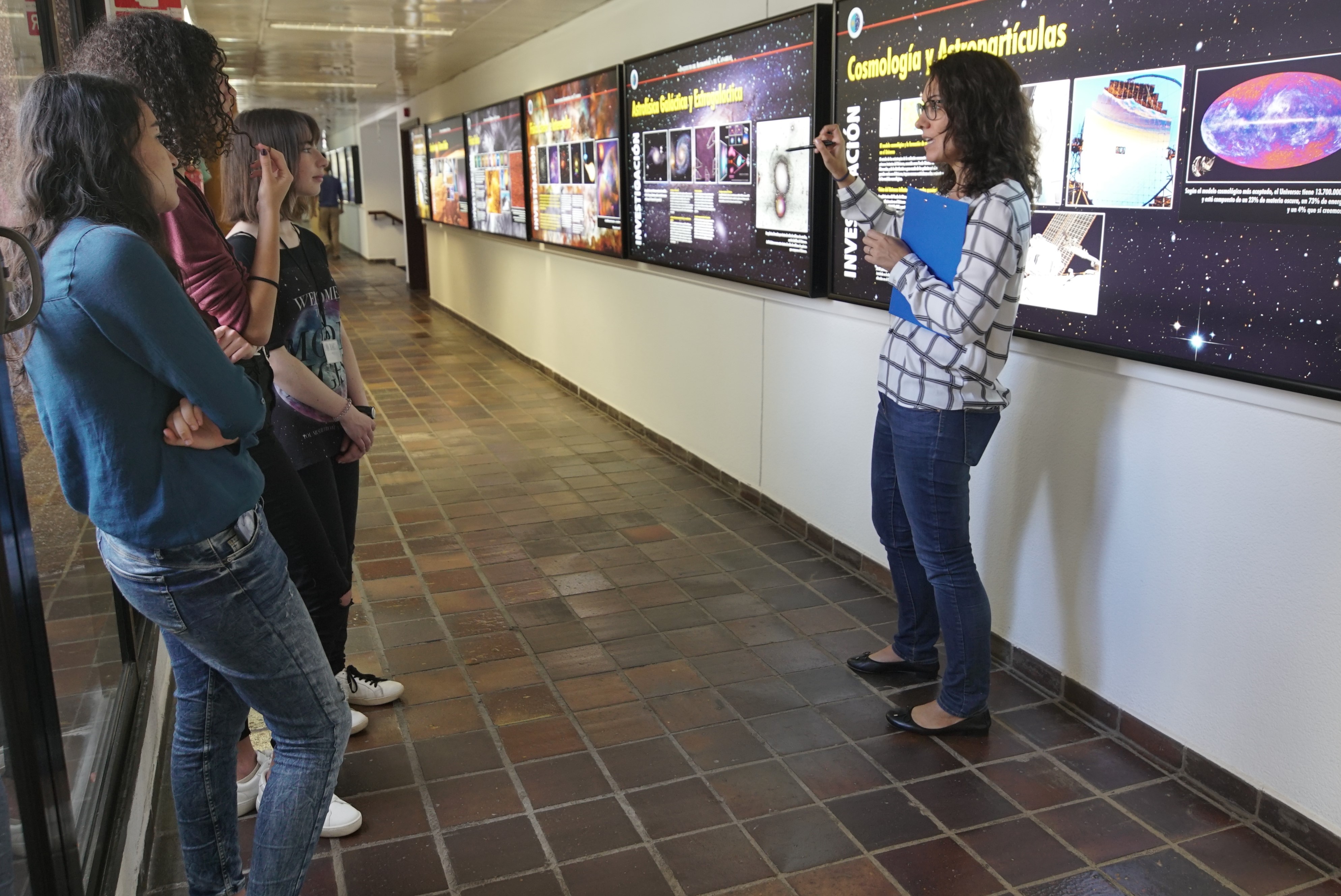 Sandra Benítez talks about the research areas of the IAC to the three participants of the Canarias Masterclass programme who visited the IAC on 13 June. Credit: Tamara Muñiz Pérez (IAC).