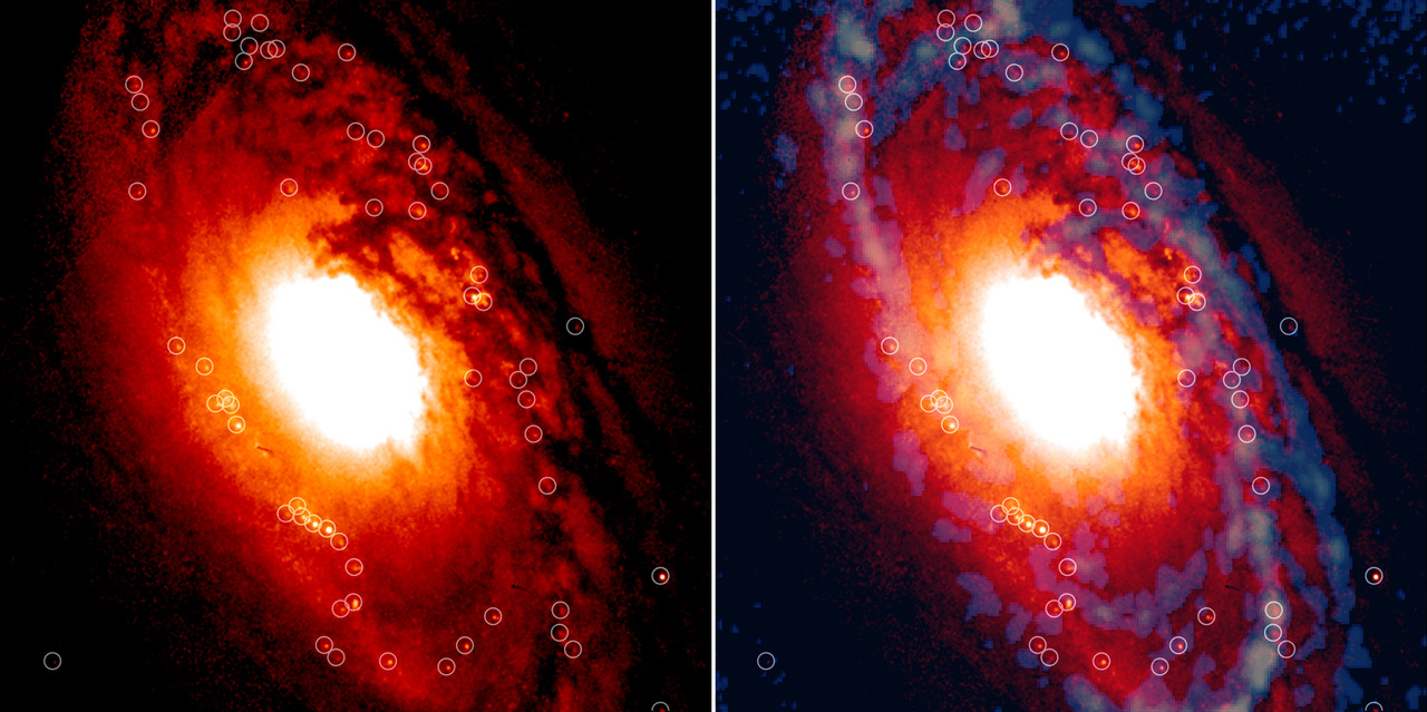 The two images show the central region of the old galaxy NGC 1386. On the left is the galaxy in visible light, taken with the Hubble Space Telescope. On the right is the same view, but combined with the image taken with the ALMA radio telescope. In both images the places where thousands of stars are being born, the young star clusters, are indicated by white circles. The clusters appear as faint points of brightness within each circle. In the visible light image you can also see dark regions, long filamentous strings, which pass close to, or end in the star clusters. These are streams of matter which carry the material used to form new stars. Although previously unknown, the same strings are shown as bright filaments, blueish regions- in the data obtained from ALMA. These filaments contain simple molecules, notably molecular hydrogen, which go into the formation of stars. Credit: HST/ ALMA. Composition: Gabriel Pérez Díaz (SMM, IAC)